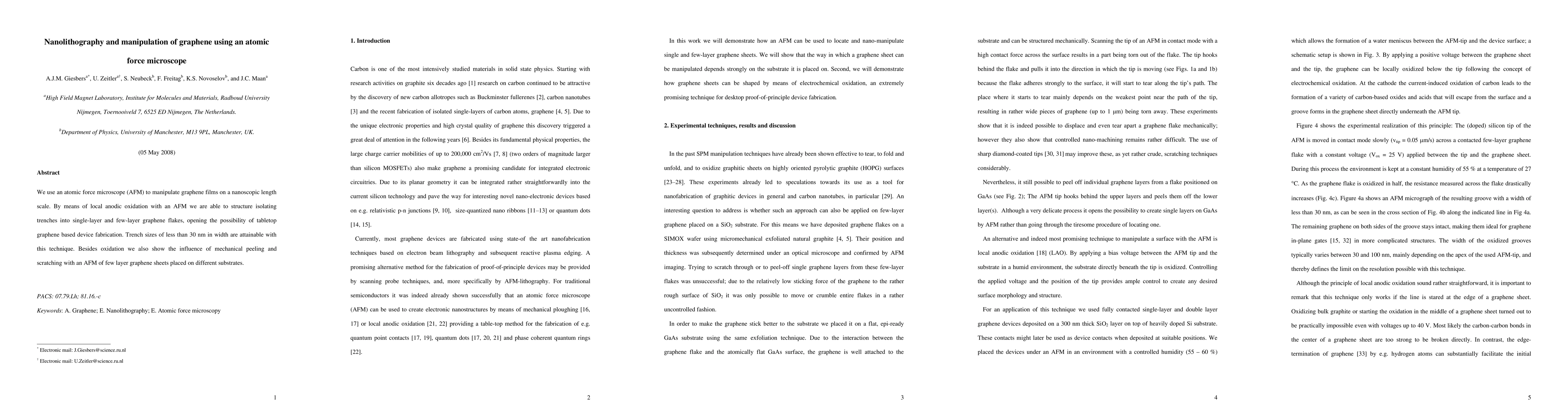 This paper demonstrates the use of an atomic force microscope (AFM) to manipulate graphene films, enabling the creation of isolating trenches as small as 30 nm wide through local anodic oxidation, and explores mechanical peeling and scratching effects on few-layer graphene on various substrates.