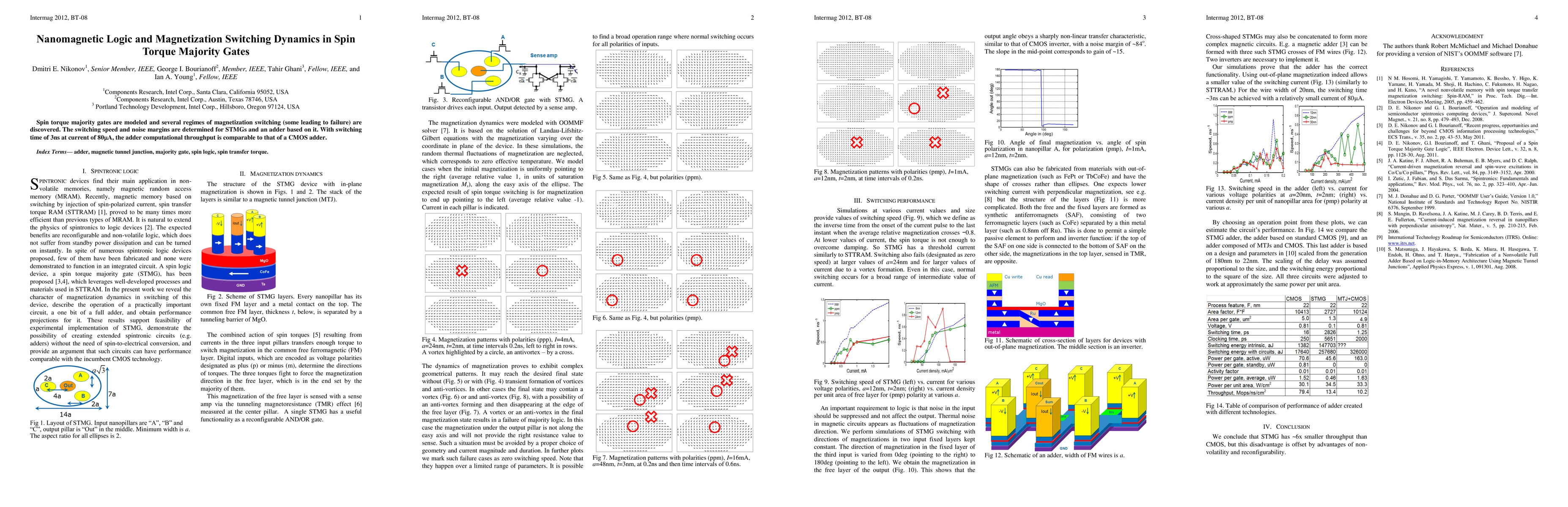 Spin torque majority gates are modeled and several regimes of magnetization switching (some leading to failure) are discovered. The switching speed and noise margins are determined for STMGs and an adder based on it. With switching time of 3ns at current of 80uA, the adder computational throughput is comparable to that of a CMOS adder.