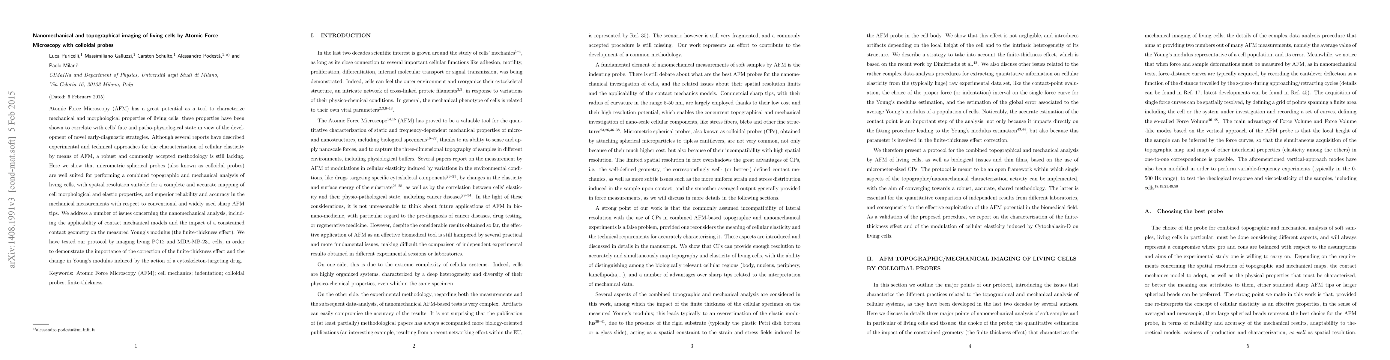 This paper demonstrates the use of colloidal probes in Atomic Force Microscopy for high-resolution nanomechanical and topographical imaging of living cells, showing improved reliability and accuracy over conventional sharp tips. The study addresses the finite-thickness effect and its impact on measured cell elasticity, validated through imaging of PC12 and MDA-MB-231 cells.