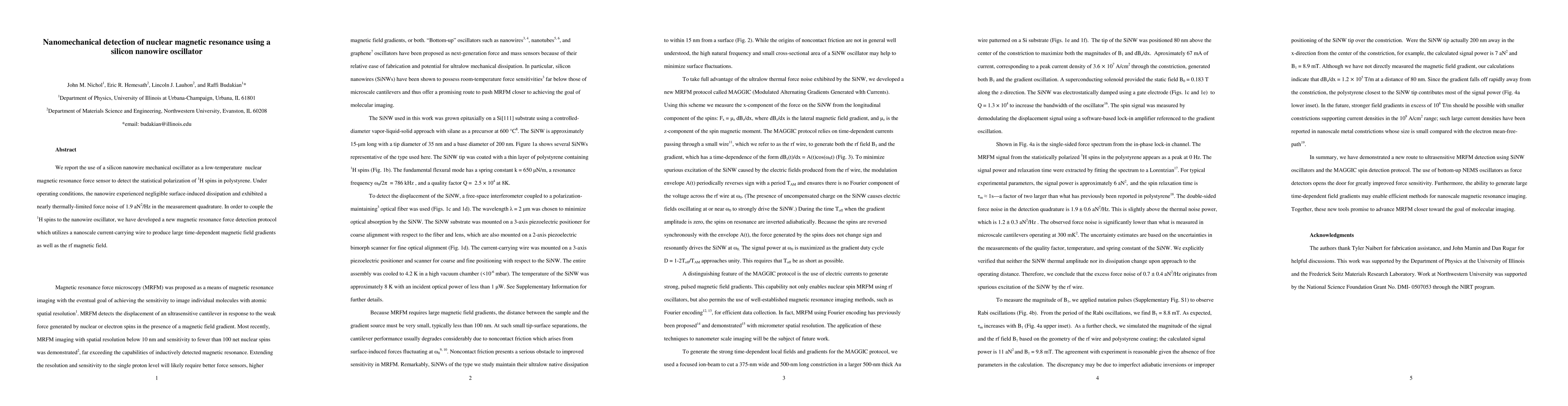 This paper describes a silicon nanowire oscillator used to detect nuclear magnetic resonance (NMR) by sensing the statistical polarization of 1H spins in polystyrene. The developed protocol employs a nanoscale current-carrying wire to generate necessary magnetic field gradients and radiofrequency fields, achieving low-temperature sensitivity with minimal surface-induced dissipation.