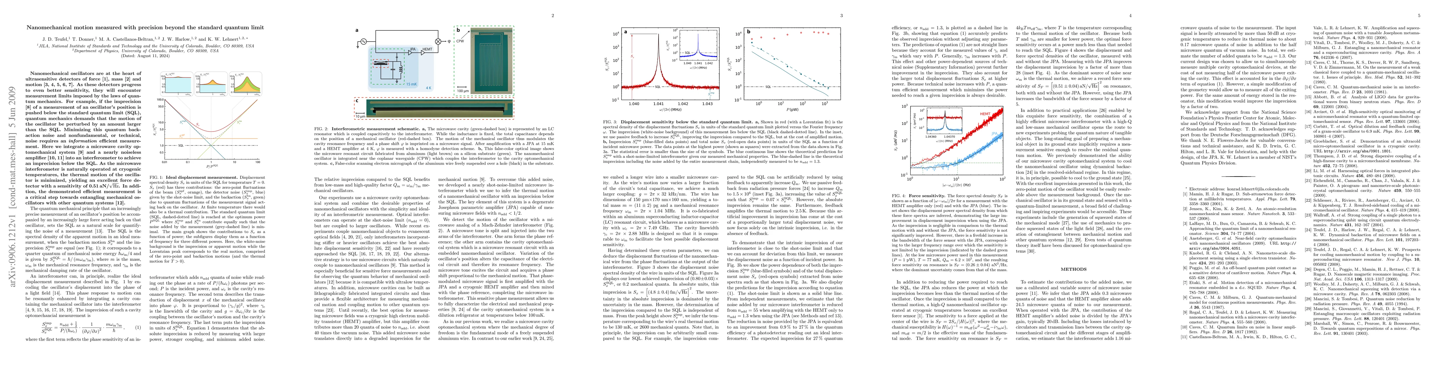 This paper reports the development of an ultrasensitive nanomechanical motion detector that measures below the standard quantum limit, achieved by integrating a microwave cavity optomechanical system and a nearly noiseless amplifier into an interferometer, demonstrating a force sensitivity of 0.51 aN/rt(Hz) and paving the way for entangling mechanical oscillators with other quantum systems.