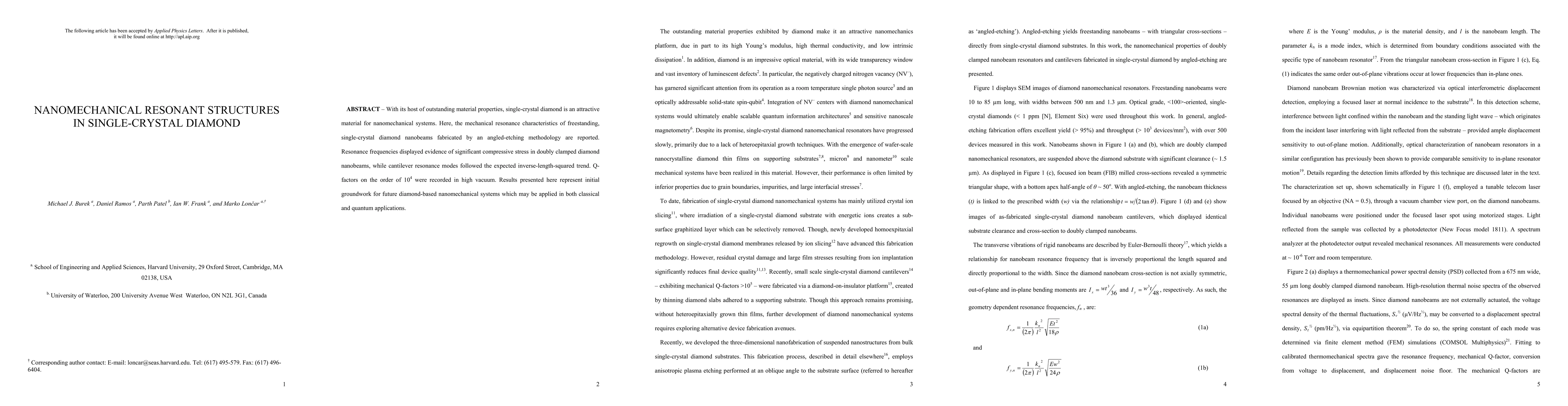 This paper investigates the mechanical resonance characteristics of single-crystal diamond nanobeams, revealing significant compressive stress in doubly clamped beams and high-quality factors of around 10⁴ in vacuum. The findings lay the foundation for potential diamond-based nanomechanical systems in classical and quantum applications.