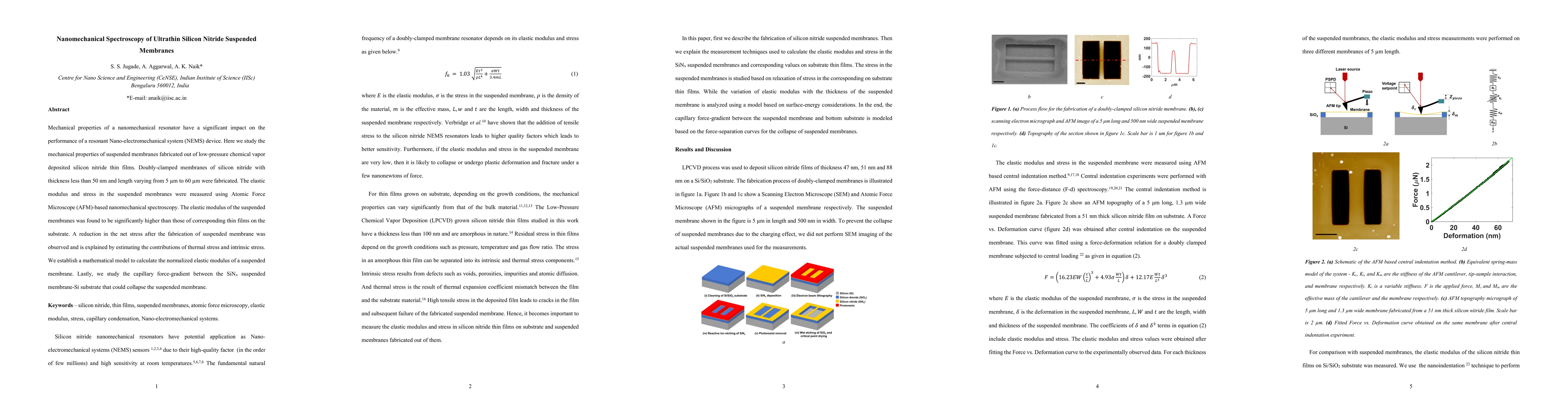 This study investigates the mechanical properties of ultrathin silicon nitride membranes using nanomechanical spectroscopy, revealing a higher elastic modulus and reduced stress in suspended membranes compared to thin films on substrates. The research also develops a model to calculate the normalized elastic modulus and examines the capillary forces that could potentially collapse the membranes.
