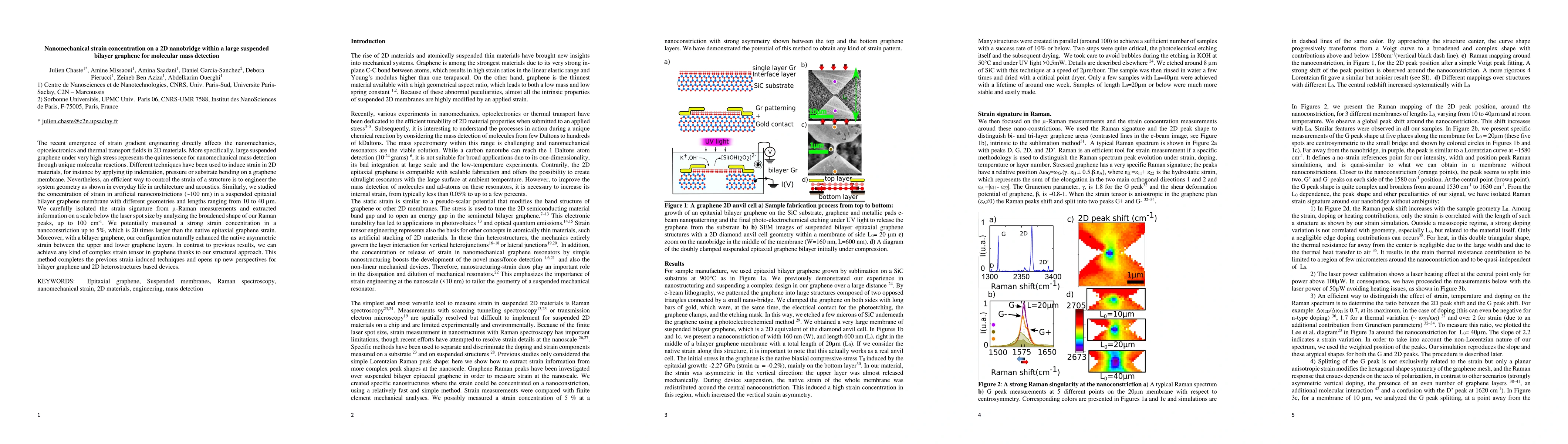 This paper investigates the strain concentration in suspended bilayer graphene nanobridges under various geometries for enhanced nanomechanical mass detection. The study demonstrates significant strain concentration in nanoconstrictions, up to 5%, using micro-Raman spectroscopy, which could improve the sensitivity of 2D material-based devices.