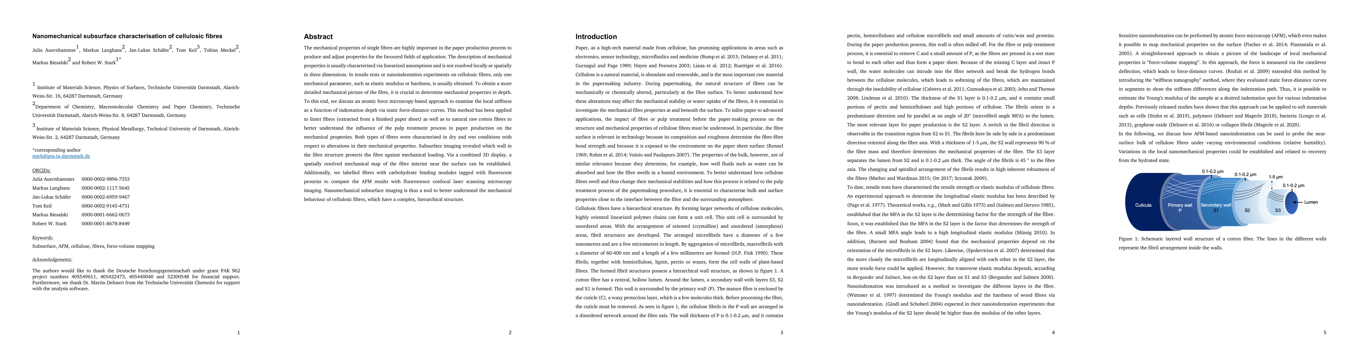 This paper explores the use of atomic force microscopy for nanomechanical subsurface characterisation of cellulosic fibres, revealing local stiffness variations in linter and cotton fibres under dry and wet conditions. The study provides spatially resolved mechanical maps and identifies fibre wall protection mechanisms, enhancing understanding of the impact of pulp treatment on fibre mechanical properties.