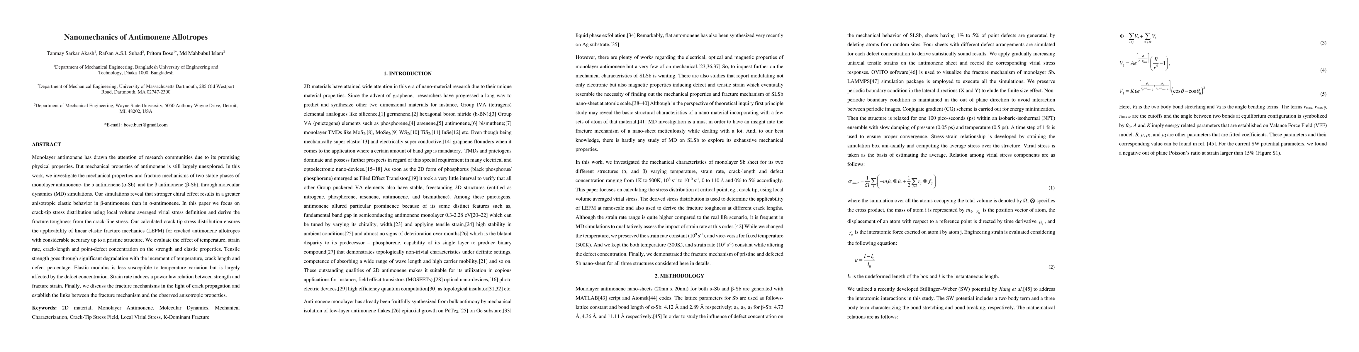 Researchers studied the mechanical properties of two antimonene allotropes using molecular dynamics simulations, finding that one shows stronger anisotropic behavior than the other, with effects from temperature, strain rate, and defects on strength and elasticity.