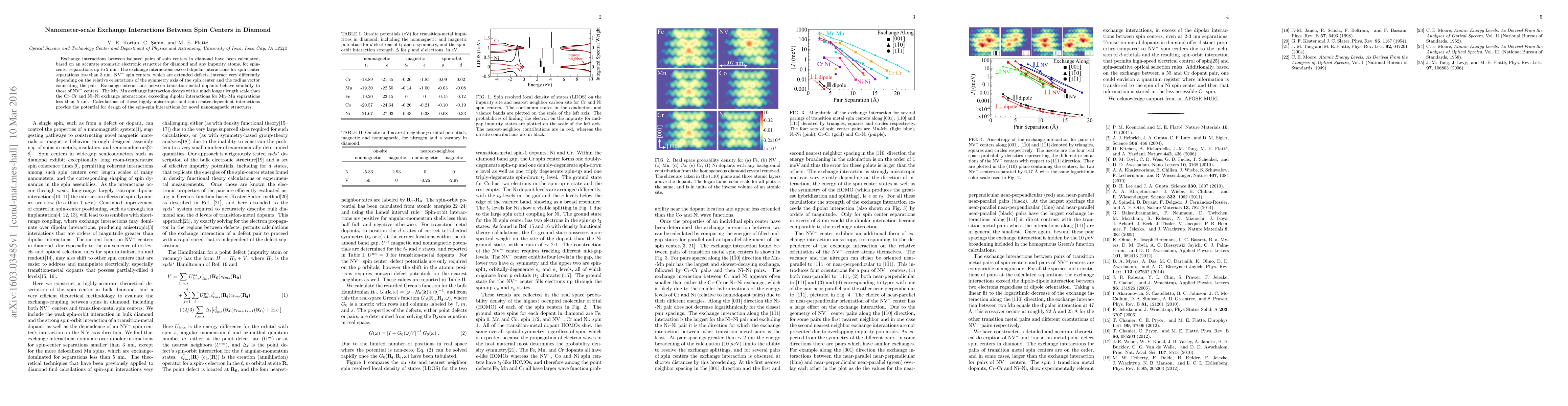This study calculates nanometer-scale exchange interactions between spin centers in diamond, finding that exchange interactions surpass dipolar interactions for separations less than 3 nm. It highlights the unique anisotropic behavior of NV$^-$ centers and transition-metal dopants, with Mn-Mn interactions persisting beyond 5 nm.