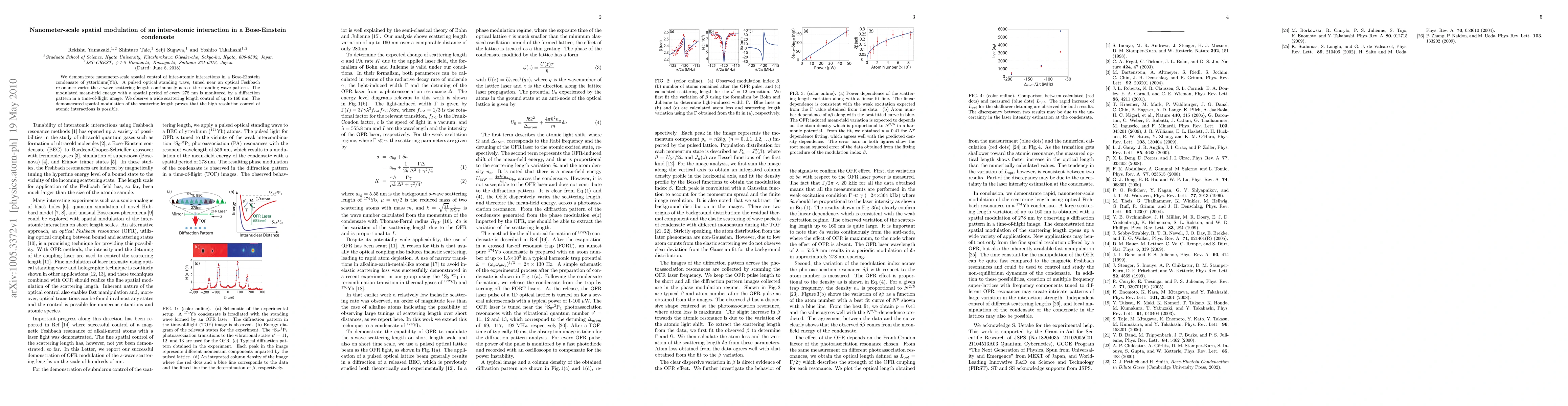 This paper demonstrates the ability to modulate inter-atomic interactions at nanometer scales in a Bose-Einstein condensate using a pulsed optical standing wave near an optical Feshbach resonance, achieving up to 160 nm control over the scattering length. The spatial modulation is verified by observing the modulated mean-field energy through a diffraction pattern in a time-of-flight image.