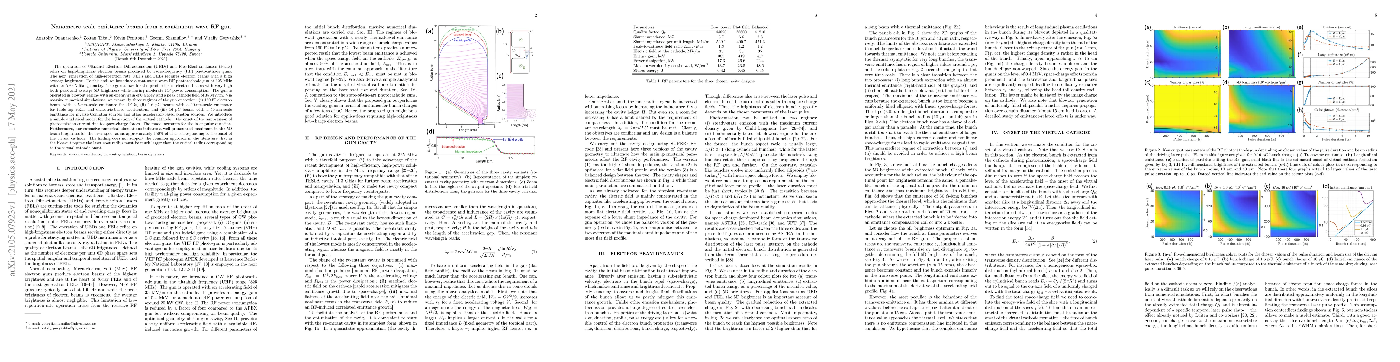 This paper introduces a continuous-wave RF photocathode gun producing high-brightness electron beams for UEDs and FELs, achieving nanometre-scale emittance beams across various charge regimes. The study challenges conventional wisdom on laser spot radius in the blowout regime, suggesting optimal performance for a laser spot radius at 150% of the virtual cathode onset radius.