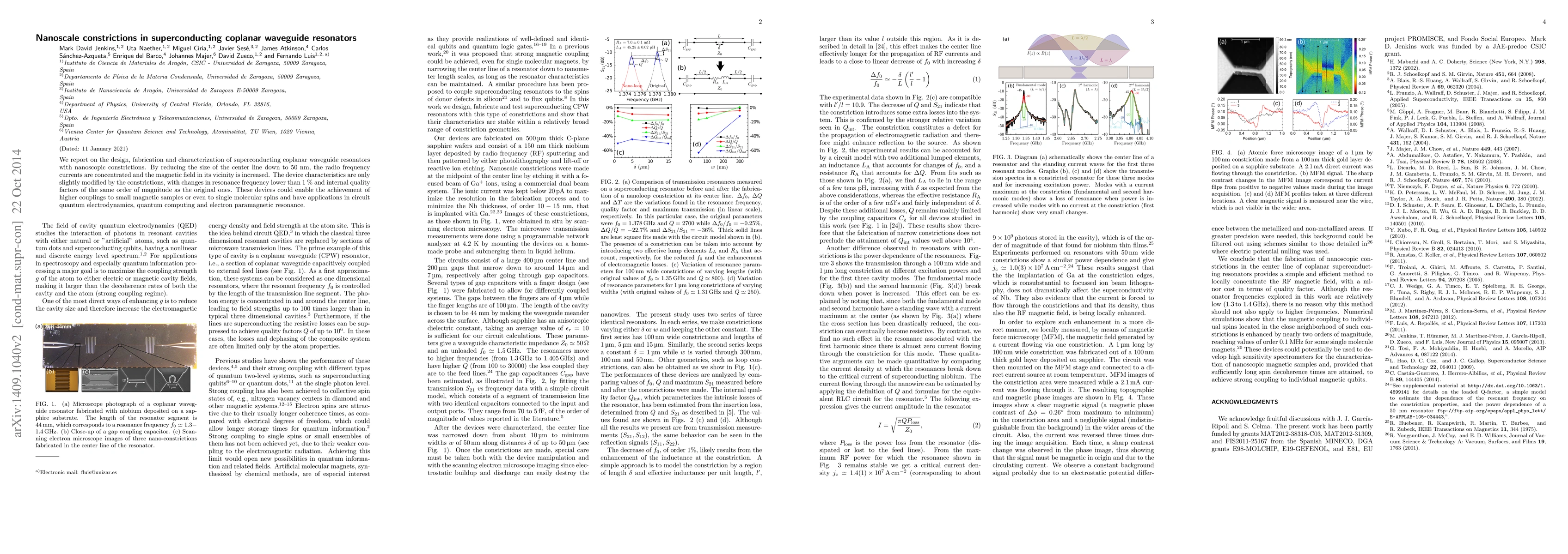 This paper details the design and fabrication of superconducting coplanar waveguide resonators with 50 nm constrictions, showing minimal changes in resonance frequency and quality factors. These nanometric constrictions can enhance coupling to small magnetic samples or single molecular spins, with potential applications in quantum computing and electron paramagnetic resonance.