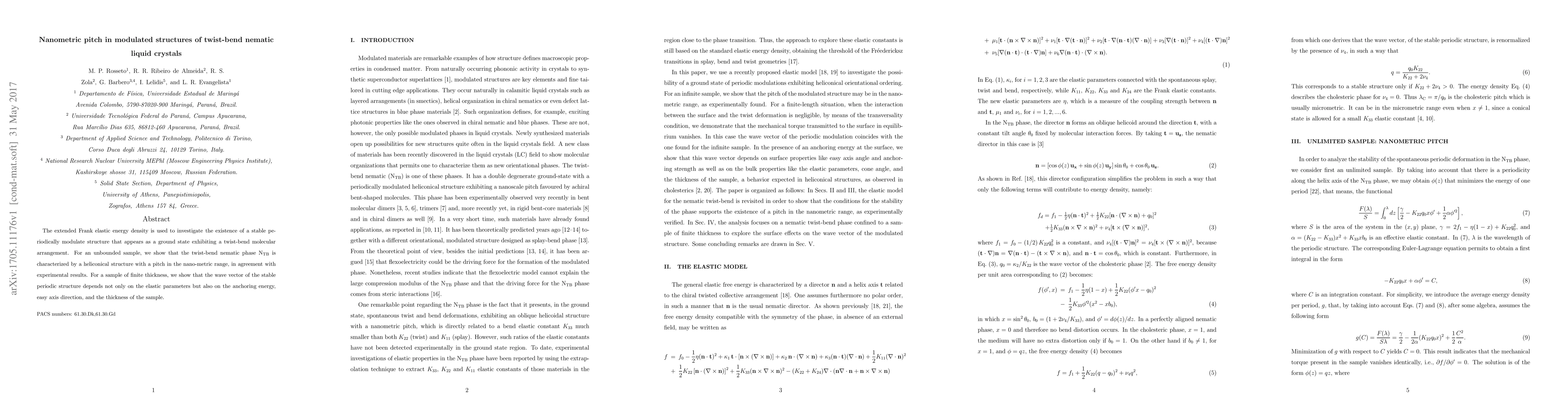 The extended Frank elastic energy density is used to investigate the existence of a stable periodically modulate structure that appears as a ground state exhibiting a twist-bend molecular arrangement. For an unbounded sample, we show that the twist-bend nematic phase $N_{TB}$ is characterized by a heliconical structure with a pitch in the nano-metric range, in agreement with experimental results. For a sample of finite thickness, we show that the wave vector of the stable periodic structure depends not only on the elastic parameters but also on the anchoring energy, easy axis direction, and the thickness of the sample.