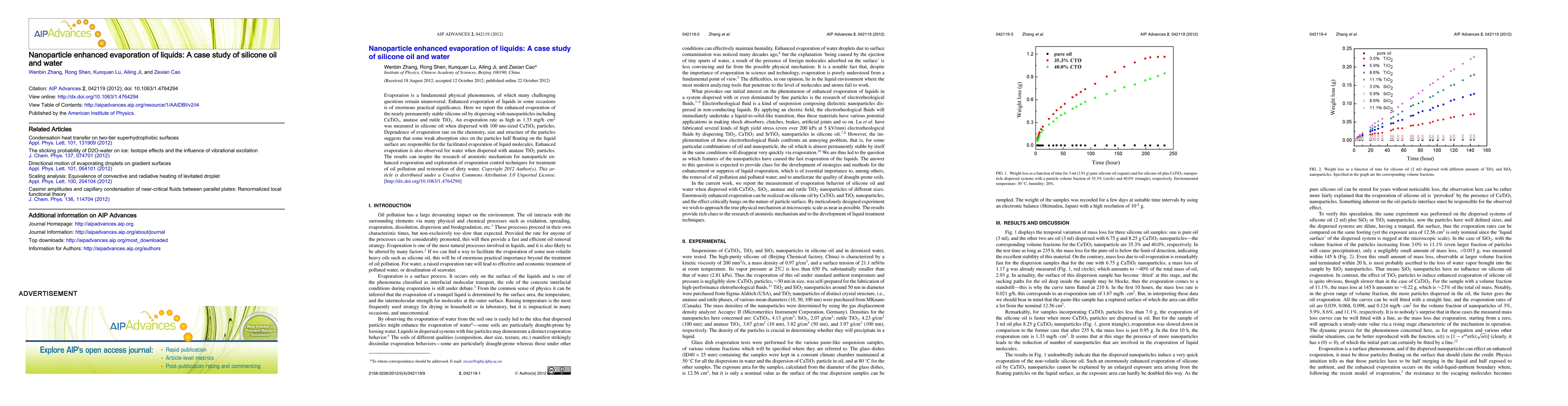 Evaporation is a fundamental physical phenomenon, of which many challenging questions remain unanswered. Enhanced evaporation of liquids in some occasions is of enormous practical significance. Here we report the enhanced evaporation of the nearly permanently stable silicone oil by dispersing with nanopariticles including CaTiO3, anatase and rutile TiO2. The results can inspire the research of atomistic mechanism for nanoparticle enhanced evaporation and exploration of evaporation control techniques for treatment of oil pollution and restoration of dirty water.