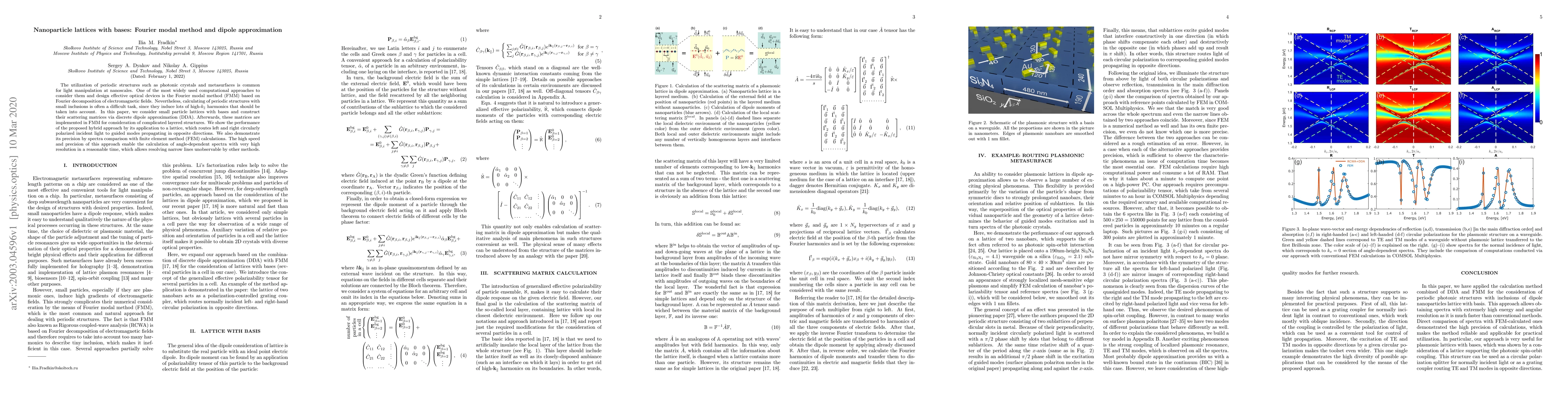 The utilization of periodic structures such as photonic crystals and metasurfaces is common for light manipulation at nanoscales. One of the most widely used computational approaches to consider them and design effective optical devices is the Fourier modal method (FMM) based on Fourier decomposition of electromagnetic fields. Nevertheless, calculating of periodic structures with small inclusions is often a difficult task, since they induce lots of high-$k_\parallel$ harmonics that should be taken into account. In this paper, we consider small particle lattices with bases and construct their scattering matrices via discrete dipole approximation (DDA). Afterwards, these matrices are implemented in FMM for consideration of complicated layered structures. We show the performance of the proposed hybrid approach by its application to a lattice, which routes left and right circularly polarized incident light to guided modes propagating in opposite directions. We also demonstrate its precision by spectra comparison with finite element method (FEM) calculations. The high speed and precision of this approach enable the calculation of angle-dependent spectra with very high resolution in a reasonable time, which allows resolving narrow lines unobservable by other methods.