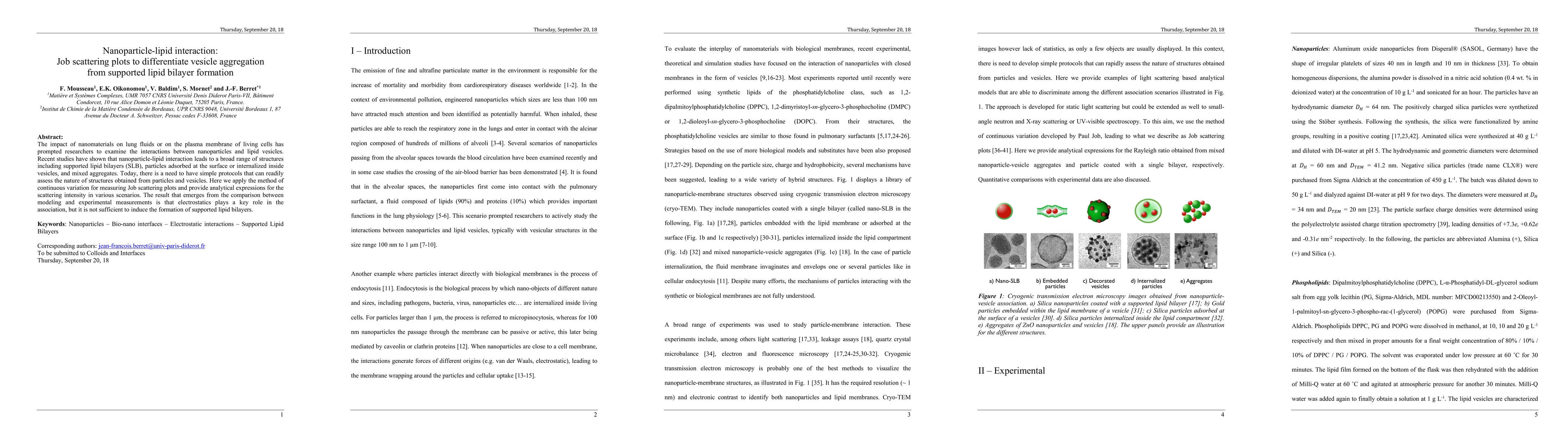 Researchers studied nanoparticle-lipid interactions using Job scattering plots to distinguish between vesicle aggregation and supported lipid bilayer formation, finding that electrostatics plays a key role but is not enough for bilayer formation.