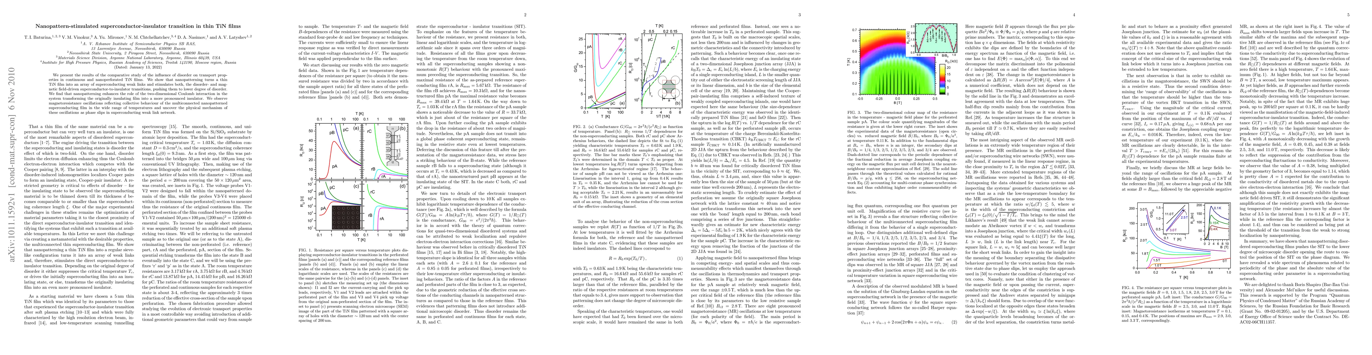 We present the results of the comparative study of the influence of disorder on transport properties in continuous and nanoperforated TiN films. We show that nanopatterning turns a thin TiN film into an array of superconducting weak links and stimulates both, the disorder- and magnetic field-driven superconductor-to-insulator transitions, pushing them to lower degree of disorder. We find that nanopatterning enhances the role of the two-dimensional Coulomb interaction in the system transforming the originally insulating film into a more pronounced insulator. We observe magnetoresistance oscillations reflecting collective behaviour of the multiconnected nanopatterned superconducting film in the wide range of temperatures and uncover the physical mechanism of these oscillations as phase slips in superconducting weak link network.