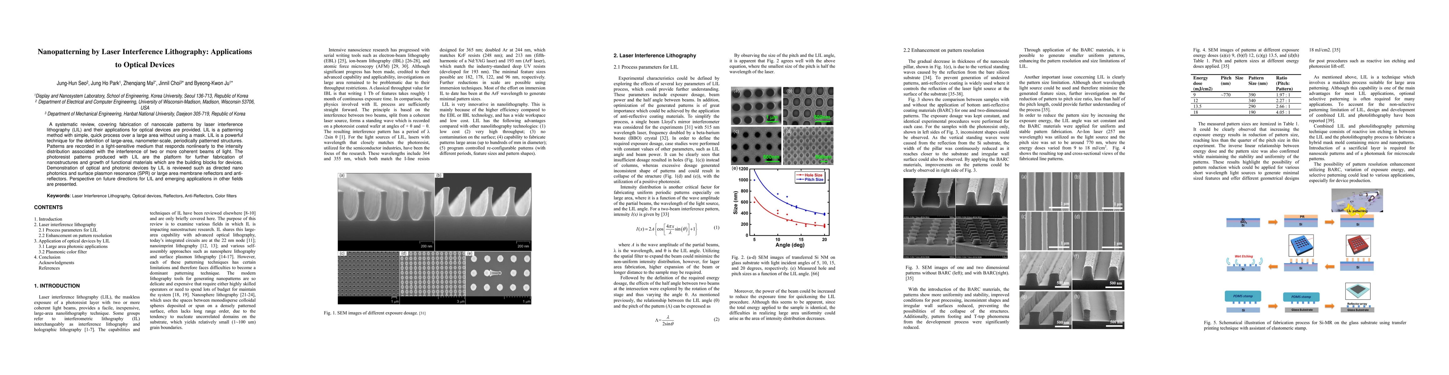 A systematic review, covering fabrication of nanoscale patterns by laser interference lithography (LIL) and their applications for optical devices are provided. LIL is a patterning method with simple, quick process over a large area without using a mask. LIL is a powerful technique for the definition of large-area, nanometer-scale, periodically patterned structures. Patterns are recorded in a light-sensitive medium that responds nonlinearly to the intensity distribution associated with the interference of two or more coherent beams of light. The photoresist patterns produced with LIL are the platform for further fabrication of nanostructures and growth of functional materials which are the building blocks for devices. Demonstration of optical and photonic devices by LIL is reviewed such as directed nano photonics and surface plasmon resonance (SPR) or large area membrane reflectors and anti-reflectors. Perspective on future directions for LIL and emerging applications in other fields are presented.