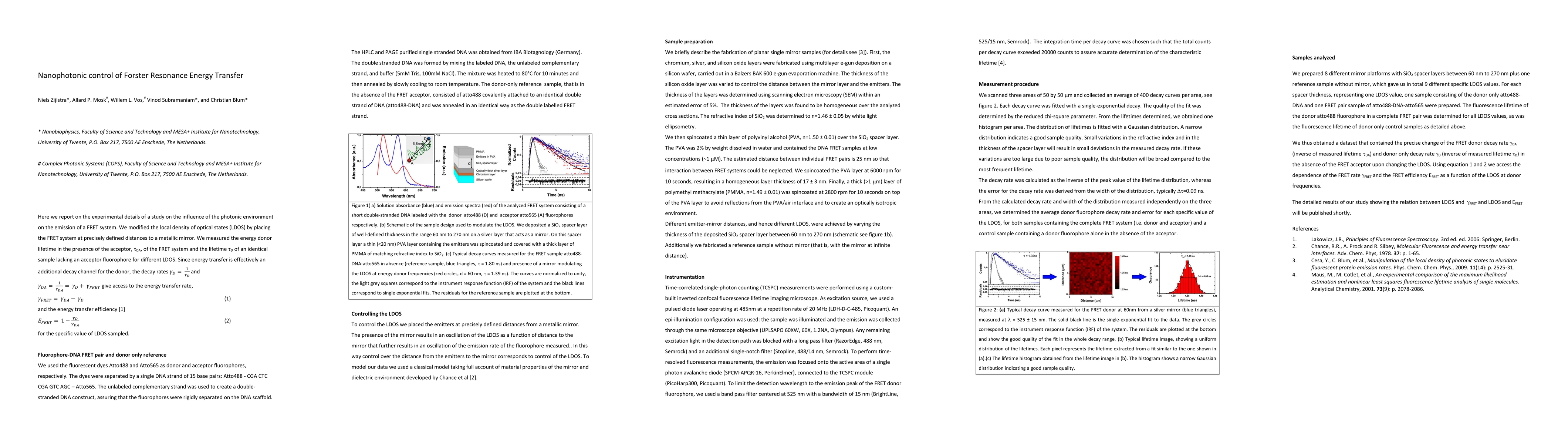 This study investigates how the photonic environment affects Forster Resonance Energy Transfer (FRET) by modifying the local density of optical states (LDOS) near a metallic mirror. The researchers measured donor fluorophore lifetimes with and without an acceptor, determining the FRET rate and efficiency for different LDOS configurations.