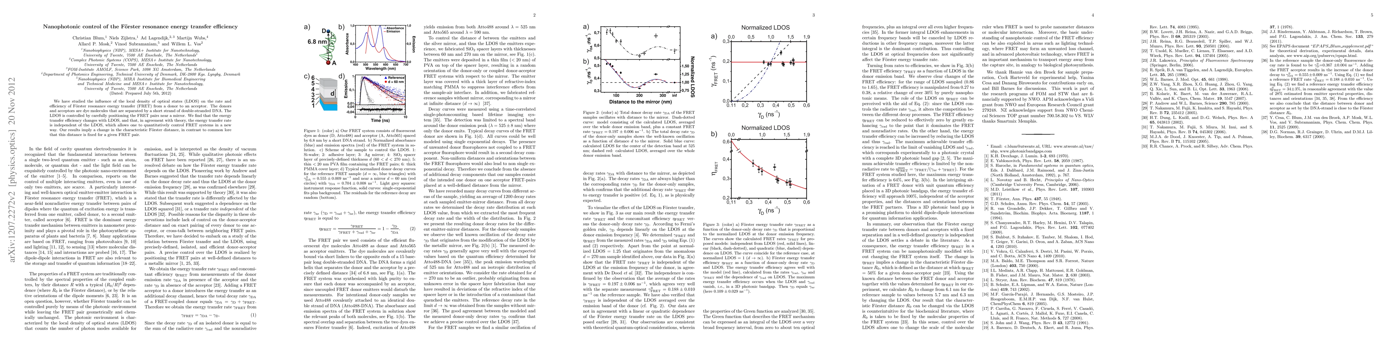 We have studied the influence of the local density of optical states (LDOS) on the rate and efficiency of Forster resonance energy transfer (FRET) from a donor to an acceptor. The donors and acceptors are dye molecules that are separated by a short strand of double-stranded DNA. The LDOS is controlled by carefully positioning the FRET pairs near a mirror. We find that the energy transfer efficiency changes with LDOS, and that, in agreement with theory, the energy transfer rate is independent of the LDOS, which allows one to quantitatively control FRET systems in a new way. Our results imply a change in the characteristic Forster distance, in contrast to common lore that this distance is fixed for a given FRET pair.