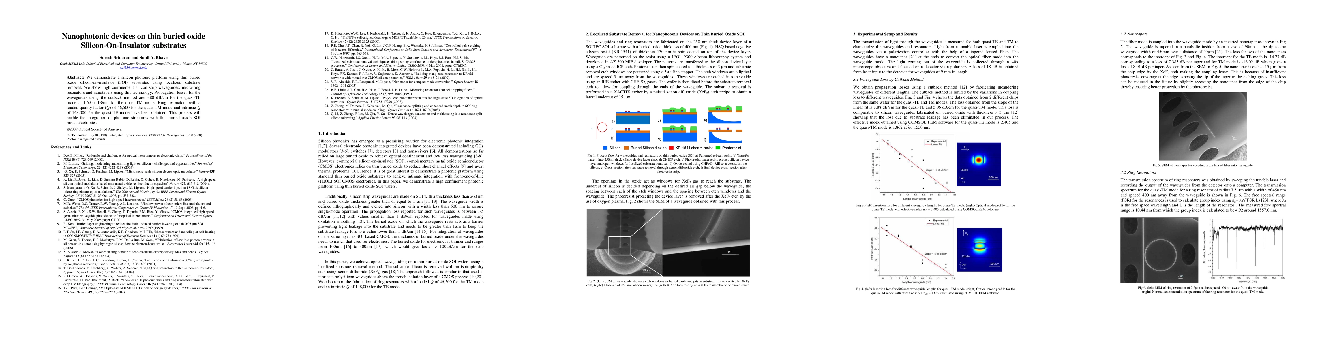 This paper demonstrates a silicon photonic platform on thin buried oxide Silicon-On-Insulator substrates, achieving high-performance waveguides, micro-ring resonators, and nanotapers with low propagation losses and high quality factors. The technology facilitates the integration of photonic devices with SOI-based electronics.