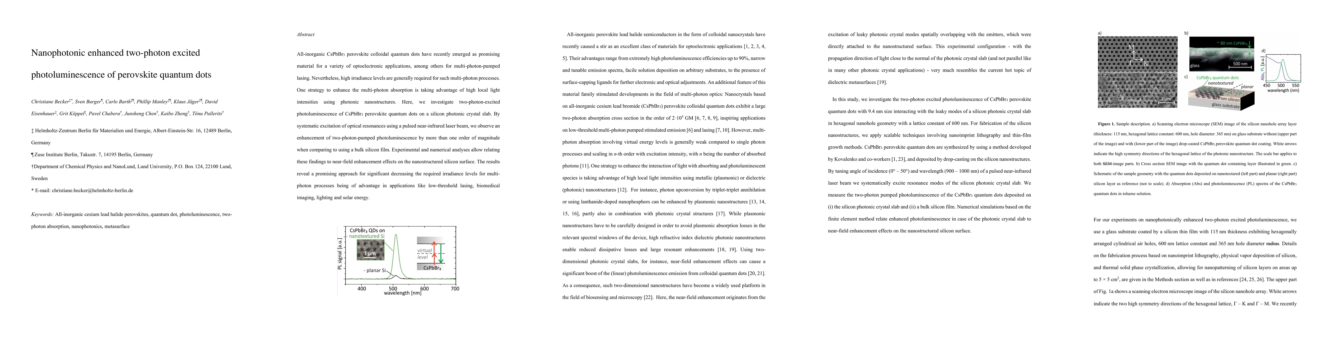 This paper investigates the enhancement of two-photon-excited photoluminescence in CsPbBr3 perovskite quantum dots using a silicon photonic crystal slab, achieving an over tenfold increase compared to bulk silicon. The findings suggest a significant reduction in required irradiance for multi-photon processes, beneficial for applications such as low-threshold lasing and biomedical imaging.