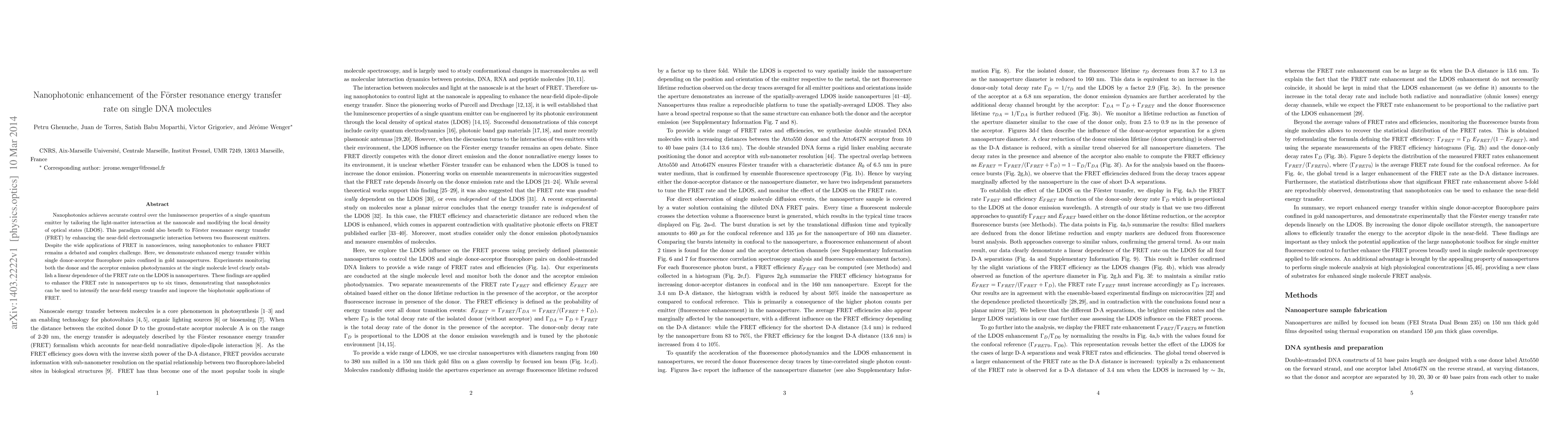 This research demonstrates the use of nanophotonics to enhance Förster resonance energy transfer (FRET) rates in single DNA molecules by manipulating the local density of optical states (LDOS) within gold nanoapertures. The study shows a six-fold increase in FRET efficiency, proving that nanophotonic structures can significantly boost near-field electromagnetic interactions and improve biophotonic applications.