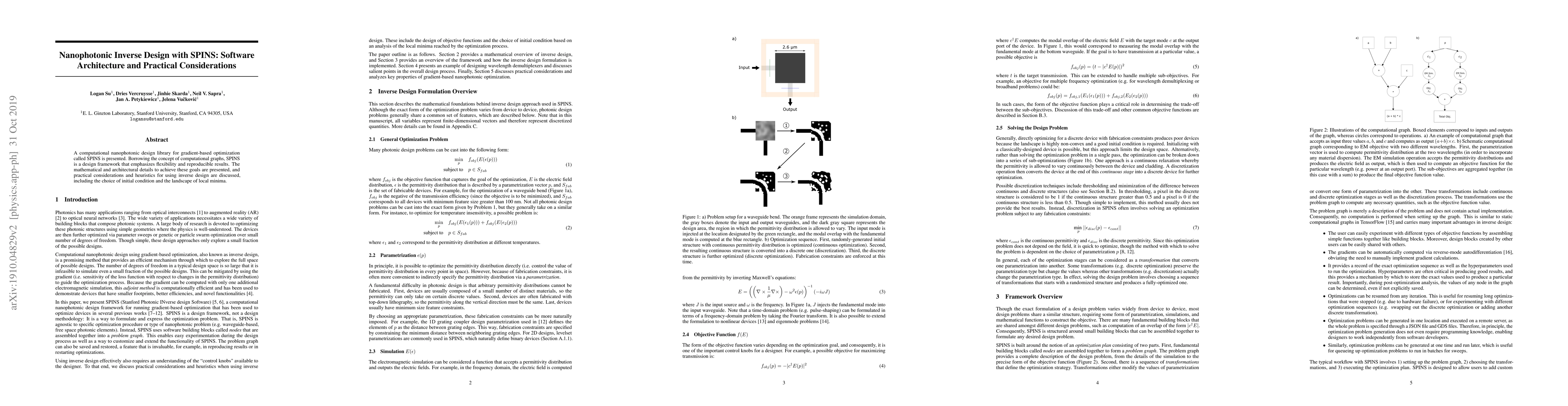 A computational nanophotonic design library for gradient-based optimization called SPINS is presented. Borrowing the concept of computational graphs, SPINS is a design framework that emphasizes flexibility and reproducible results. The mathematical and architectural details to achieve these goals are presented, and practical considerations and heuristics for using inverse design are discussed, including the choice of initial condition and the landscape of local minima.