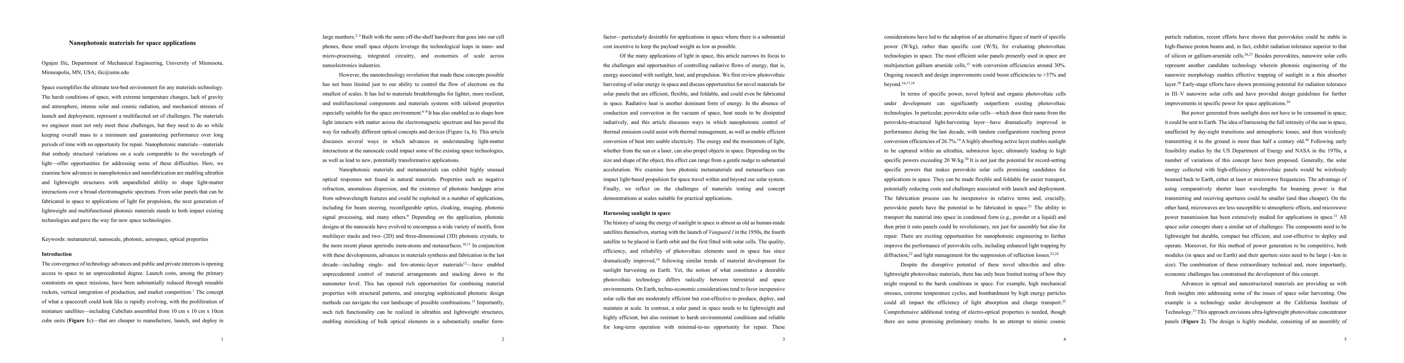 Space exemplifies the ultimate test-bed environment for any materials technology. The harsh conditions of space, with extreme temperature changes, lack of gravity and atmosphere, intense solar and cosmic radiation, and mechanical stresses of launch and deployment, represent a multifaceted set of challenges. The materials we engineer must not only meet these challenges, but they need to do so while keeping overall mass to a minimum and guaranteeing performance over long periods of time with no opportunity for repair. Nanophotonic materials -- materials that embody structural variations on a scale comparable to the wavelength of light -- offer opportunities for addressing some of these difficulties. Here, we examine how advances in nanophotonics and nanofabrication are enabling ultrathin and lightweight structures with unparalleled ability to shape light-matter interactions over a broad electromagnetic spectrum. From solar panels that can be fabricated in space to applications of light for propulsion, the next generation of lightweight and multifunctional photonic materials stands to both impact existing technologies and pave the way for new space technologies.