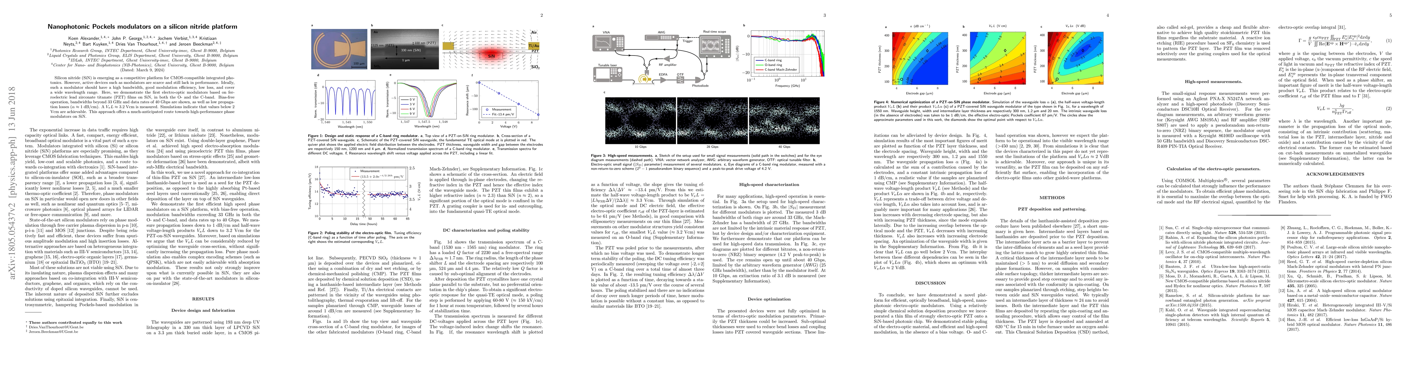 Researchers demonstrate electro-optic modulators on silicon nitride using ferroelectric lead zirconate titanate films, achieving high bandwidths, low loss, and data rates of 40 Gbps.