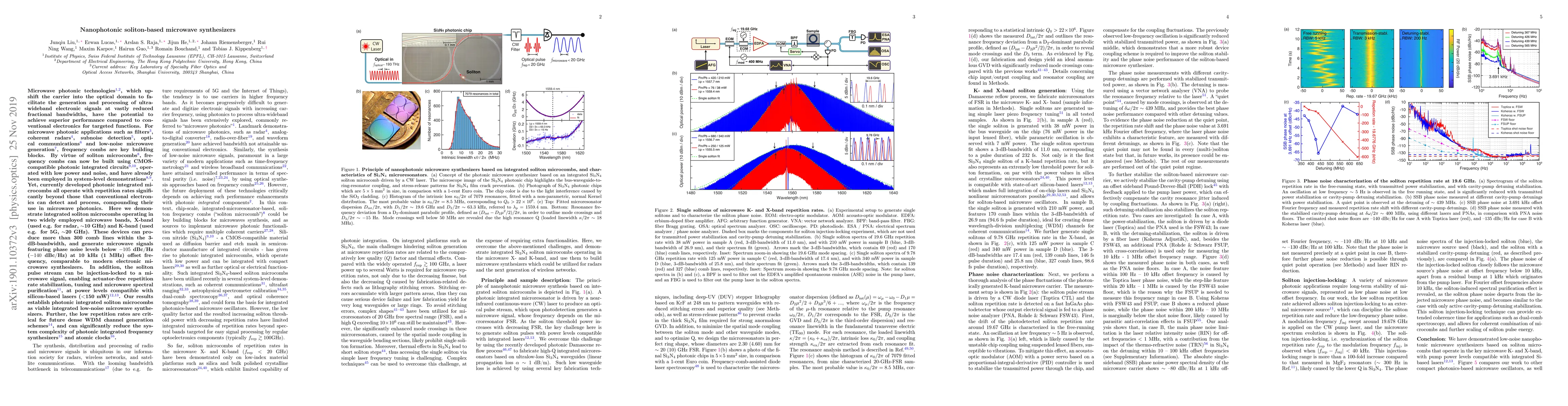 This paper presents integrated soliton microcombs for low-noise microwave synthesizers, operating in X- and K-bands, with phase noise levels comparable to modern electronic systems and repetition rates suitable for dense WDM applications. The demonstrated technology promises simplified complexity in future photonic integrated frequency synthesizers and atomic clocks.