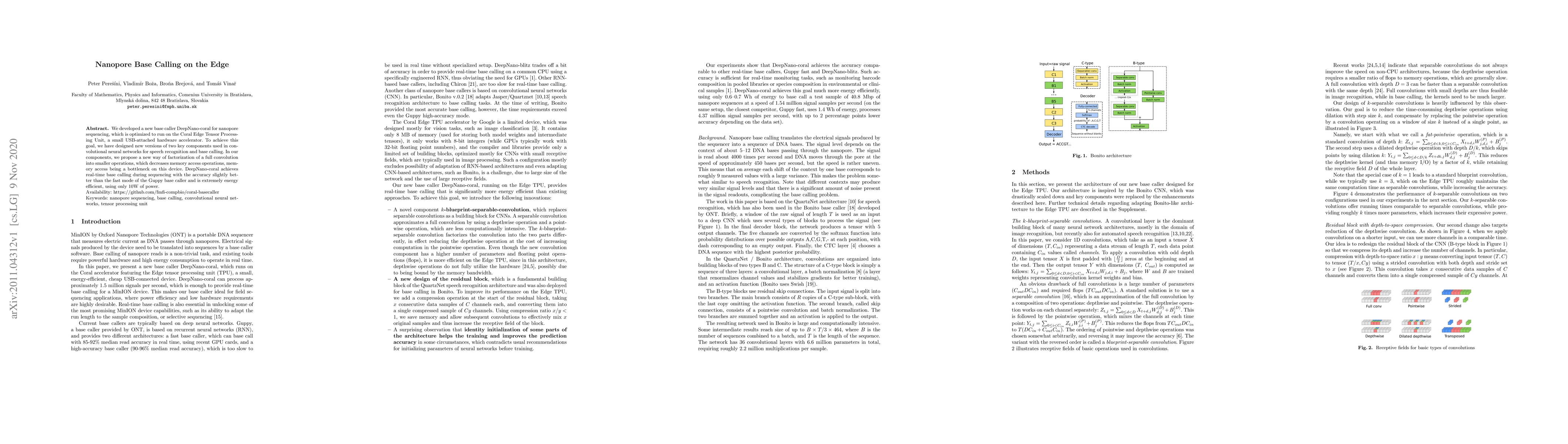 We developed a new base caller DeepNano-coral for nanopore sequencing, which is optimized to run on the Coral Edge Tensor Processing Unit, a small USB-attached hardware accelerator. To achieve this goal, we have designed new versions of two key components used in convolutional neural networks for speech recognition and base calling. In our components, we propose a new way of factorization of a full convolution into smaller operations, which decreases memory access operations, memory access being a bottleneck on this device. DeepNano-coral achieves real-time base calling during sequencing with the accuracy slightly better than the fast mode of the Guppy base caller and is extremely energy efficient, using only 10W of power. Availability: https://github.com/fmfi-compbio/coral-basecaller