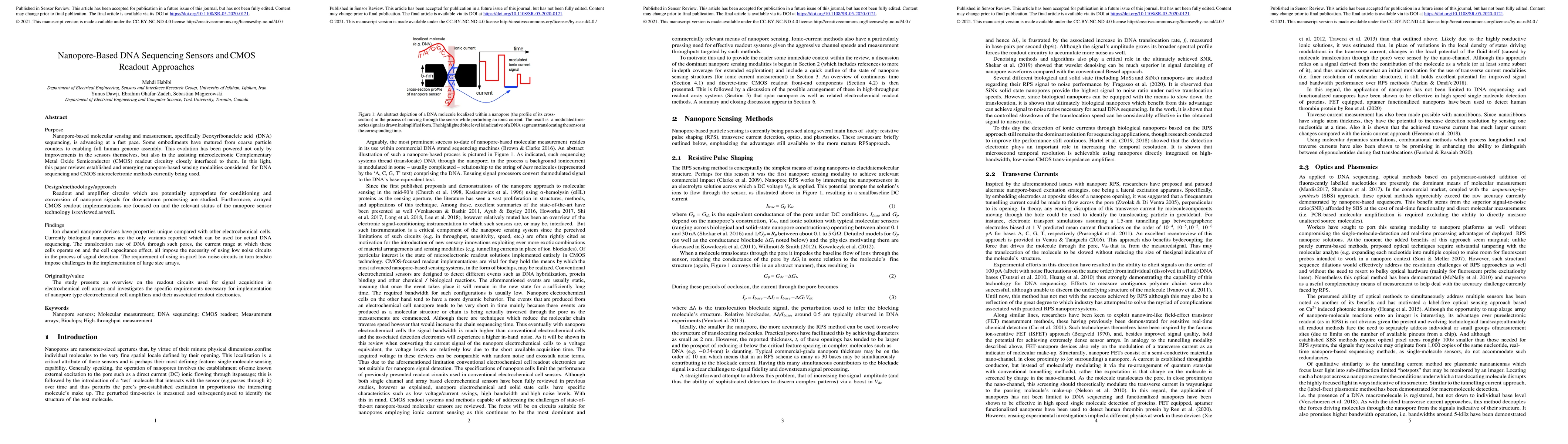 Purpose Nanopore-based molecular sensing and measurement, specifically Deoxyribonucleic acid (DNA) sequencing, is advancing at a fast pace. Some embodiments have matured from coarse particle counters to enabling full human genome assembly. This evolution has been powered not only by improvements in the sensors themselves, but also in the assisting microelectronic Complementary Metal Oxide Semiconductor (CMOS) readout circuitry closely interfaced to them. In this light, this paper reviews established and emerging nanopore-based sensing modalities considered for DNA sequencing and CMOS microelectronic methods currently being used. Design/methodology/approach Readout and amplifier circuits which are potentially appropriate for conditioning and conversion of nanopore signals for downstream processing are studied. Furthermore, arrayed CMOS readout implementations are focused on and the relevant status of the nanopore sensor technology is reviewed as well. Findings Ion channel nanopore devices have properties unique compared with other electrochemical cells. Currently biological nanopores are the only variants reported which can be used for actual DNA sequencing. The translocation rate of DNA through such pores, the current range at which these cells operate on and the cell capacitance effect, all impose the necessity of using low noise circuits in the process of signal detection. The requirement of using in-pixel low noise circuits in turn tends to impose challenges in the implementation of large size arrays. Originality/value The study presents an overview on the readout circuits used for signal acquisition in electrochemical cell arrays and investigates the specific requirements necessary for implementation of nanopore type electrochemical cell amplifiers and their associated readout electronics.