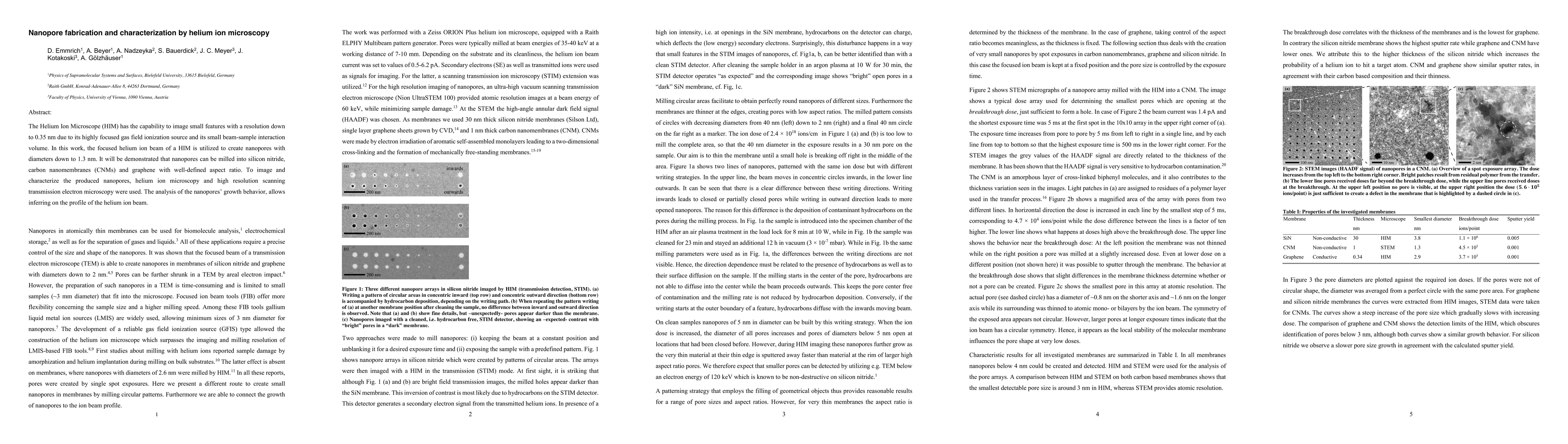 This paper explores the use of Helium Ion Microscopy (HIM) to create nanopores down to 1.3 nm in materials like silicon nitride, carbon nanomembranes, and graphene. The study employs HIM and high-resolution scanning transmission electron microscopy to characterize and analyze the nanopores, providing insights into the helium ion beam's profile.