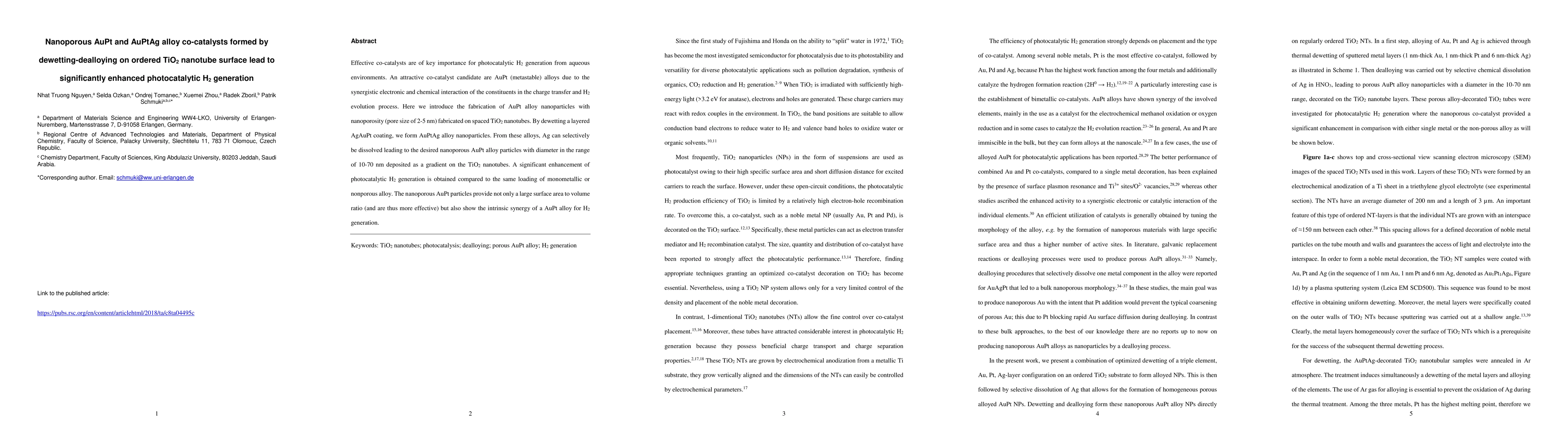 This paper presents the fabrication of nanoporous AuPt alloy co-catalysts on TiO2 nanotubes via a dewetting-dealloying process, achieving significantly enhanced photocatalytic H2 generation due to the large surface area and synergistic effects of the alloy.
