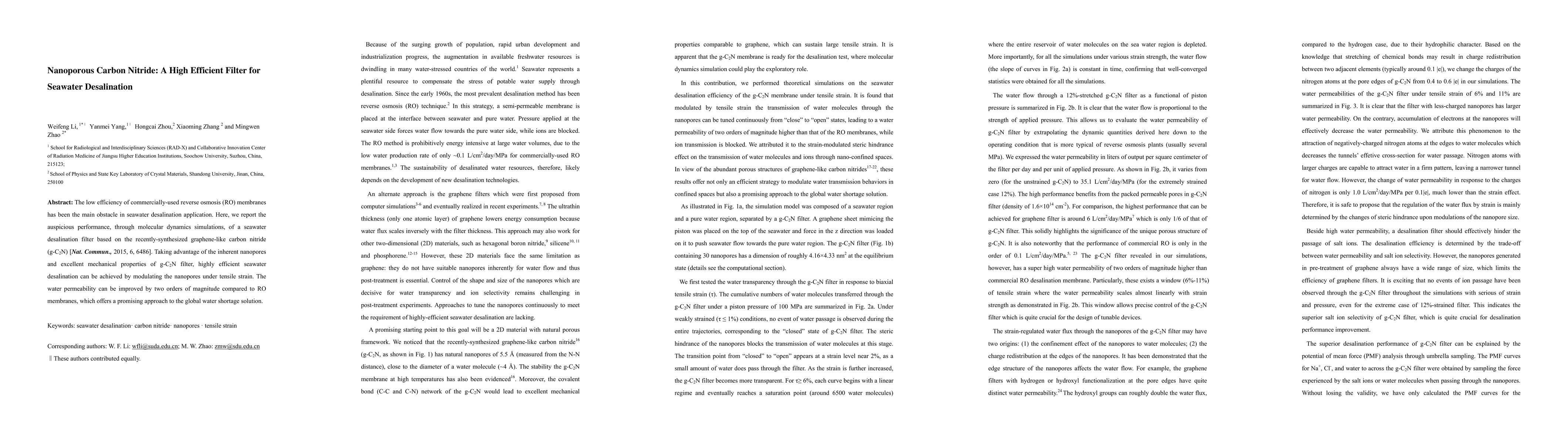 This paper reports the high efficiency of graphene-like carbon nitride (g-C2N) filters for seawater desalination, achieved through molecular dynamics simulations. The filter's nanopores, when strained, significantly improve water permeability, offering a promising solution to global water shortages.