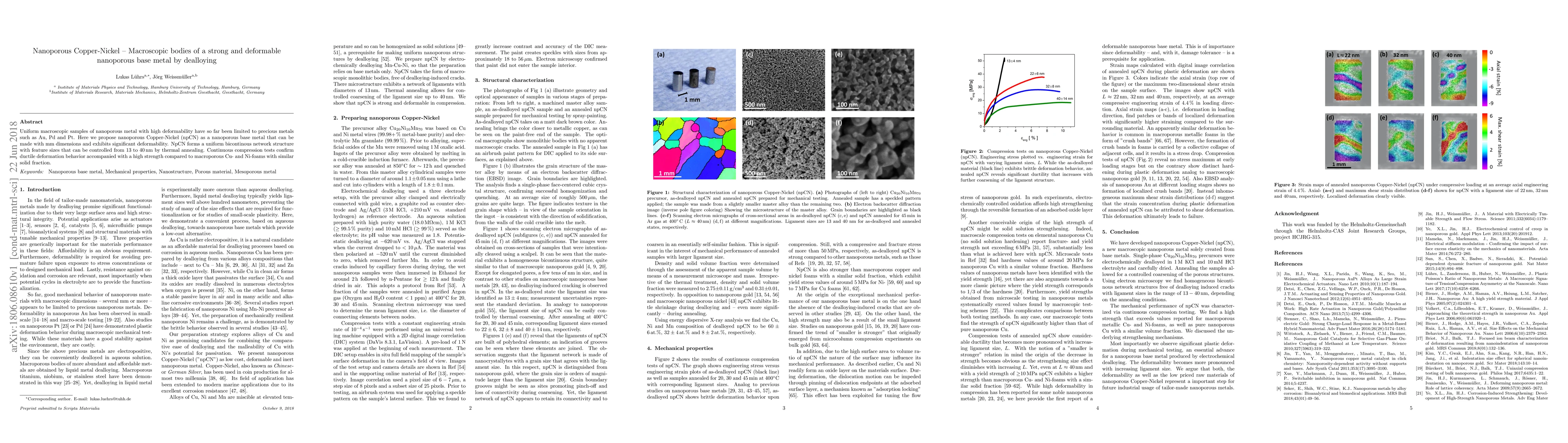 This paper introduces nanoporous Copper-Nickel (npCN) as a robust and deformable nanoporous base metal with mm dimensions, formed via dealloying. The npCN exhibits a uniform bicontinuous network structure with tunable feature sizes, demonstrating significant deformability and high strength compared to macroporous Cu- and Ni-foams.