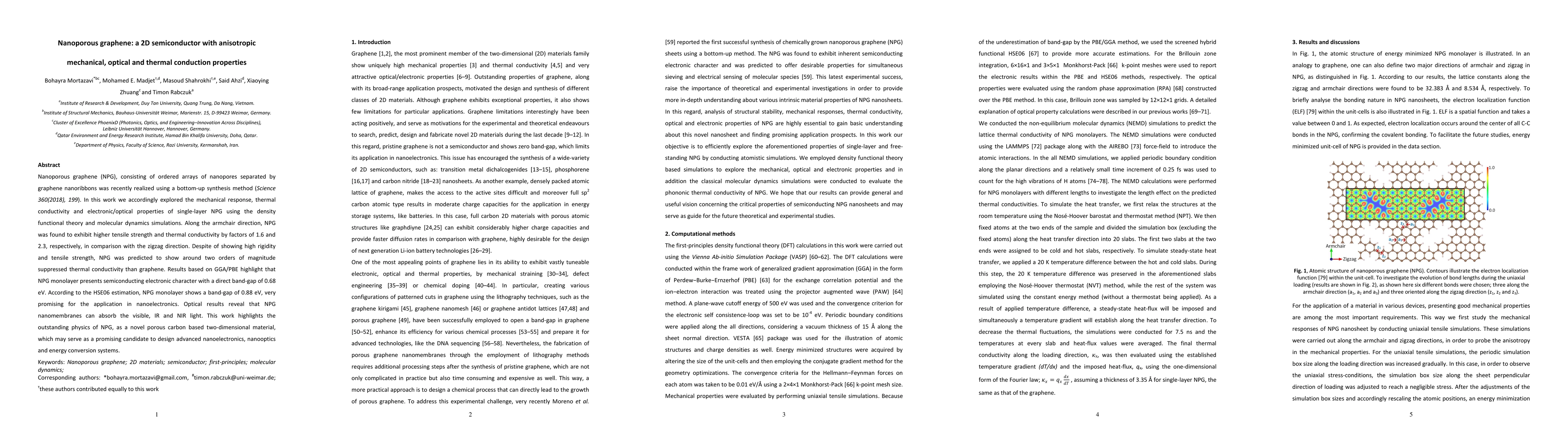 This study investigates the mechanical, thermal, electronic, and optical properties of nanoporous graphene using density functional theory and molecular dynamics simulations. It finds that NPG exhibits anisotropic mechanical strength and thermal conductivity, with higher values in the armchair direction, but significantly lower thermal conductivity compared to graphene. NPG is also predicted to be a semiconductor with promising band-gaps for nanoelectronics, and it shows potential for absorbing visible, IR, and NIR light.