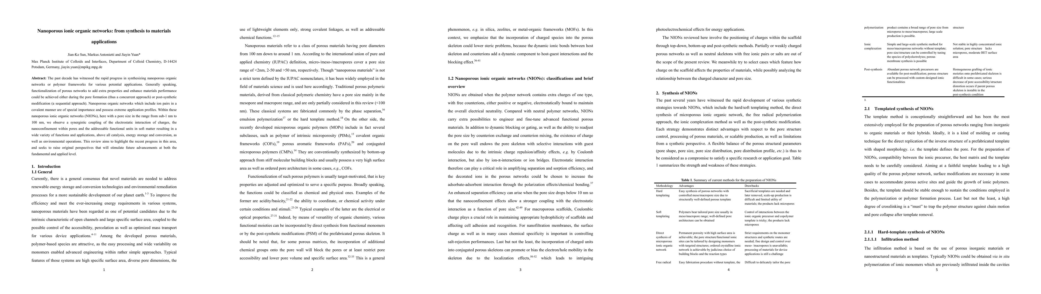 This paper reviews the synthesis and functionalization of nanoporous ionic organic networks (NIONs), emphasizing their diverse applications in catalysis, energy storage, and environmental operations. The review highlights recent advancements and proposes new perspectives to drive future research and development.