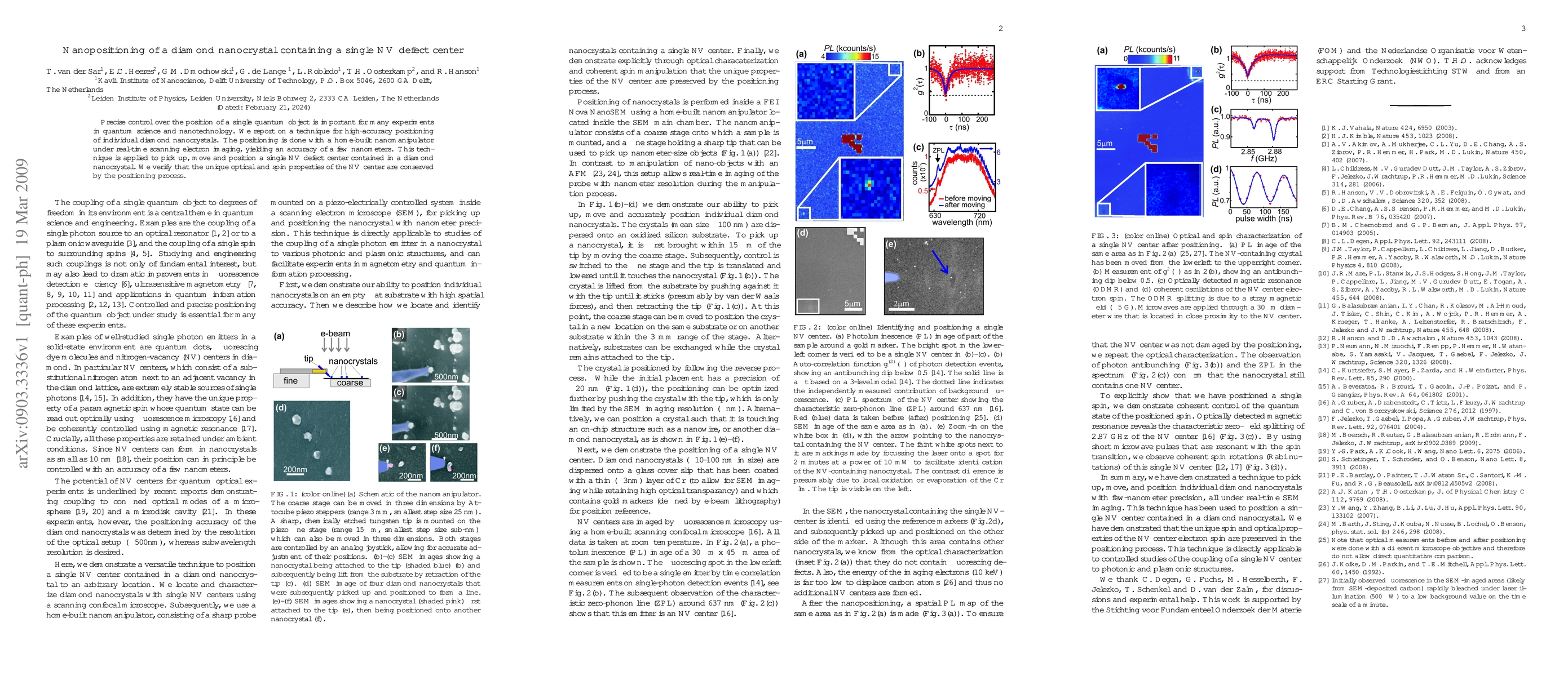 This paper presents a high-accuracy nanomanipulation technique for positioning individual diamond nanocrystals containing single NV defect centers, achieving nanometer-level precision under real-time scanning electron imaging, and confirms the preservation of the NV center's unique optical and spin properties.