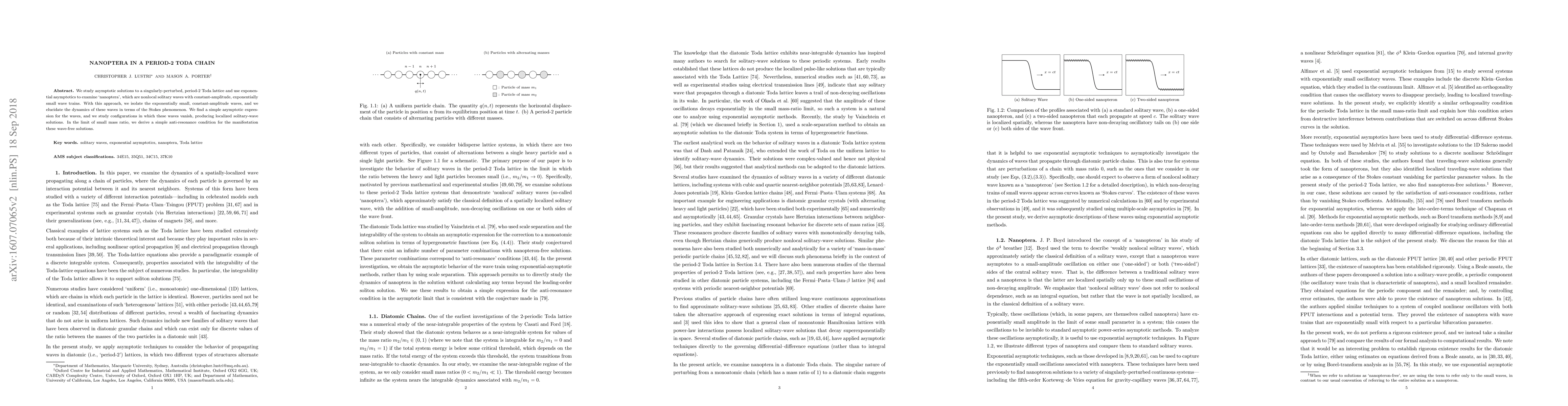 This paper investigates the asymptotic behavior of a period-2 Toda lattice under singular perturbation, focusing on "nanoptera"—nonlocal solitary waves with exponentially small wave trains. The study reveals an anti-resonance condition for the emergence of wave-free localized solutions in the limit of small mass ratio.