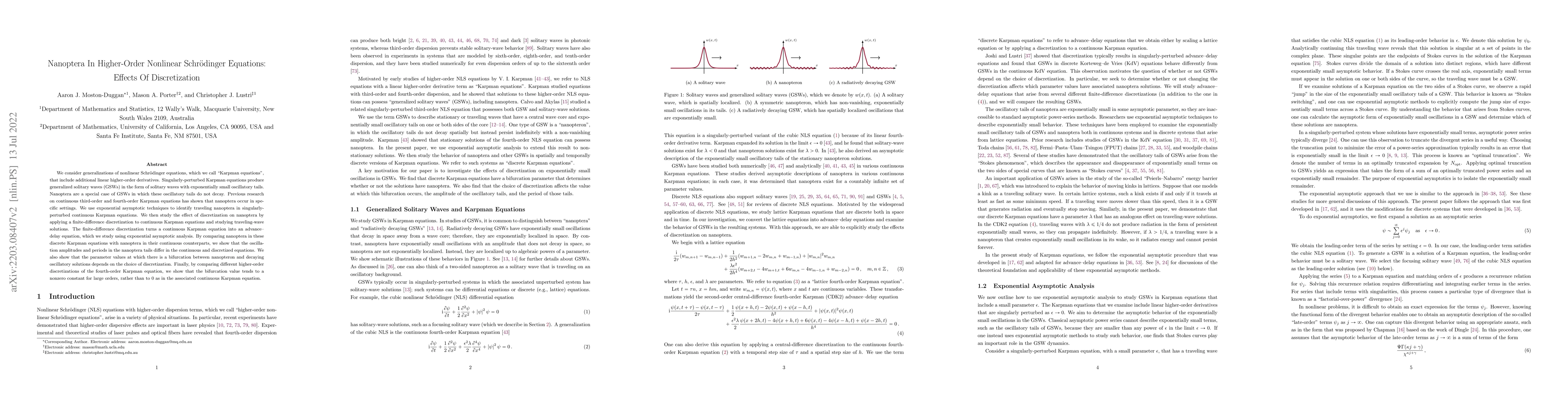 We consider generalizations of nonlinear Schr\"odinger equations, which we call "Karpman equations", that include additional linear higher-order derivatives. Singularly-perturbed Karpman equations produce generalized solitary waves (GSWs) in the form of solitary waves with exponentially small oscillatory tails. Nanoptera are a special case of GSWs in which these oscillatory tails do not decay. Previous research on continuous third-order and fourth-order Karpman equations has shown that nanoptera occur in specific settings. We use exponential asymptotic techniques to identify traveling nanoptera in singularly-perturbed continuous Karpman equations. We then study the effect of discretization on nanoptera by applying a finite-difference discretization to continuous Karpman equations and studying traveling-wave solutions. The finite-difference discretization turns a continuous Karpman equation into an advance--delay equation, which we study using exponential asymptotic analysis. By comparing nanoptera in these discrete Karpman equations with nanoptera in their continuous counterparts, we show that the oscillation amplitudes and periods in the nanoptera tails differ in the continuous and discretized equations. We also show that the parameter values at which there is a bifurcation between nanopteron and decaying oscillatory solutions depends on the choice of discretization. Finally, by comparing different higher-order discretizations of the fourth-order Karpman equation, we show that the bifurcation value tends to a nonzero constant for large orders, rather than to $0$ as in the associated continuous Karpman equation.