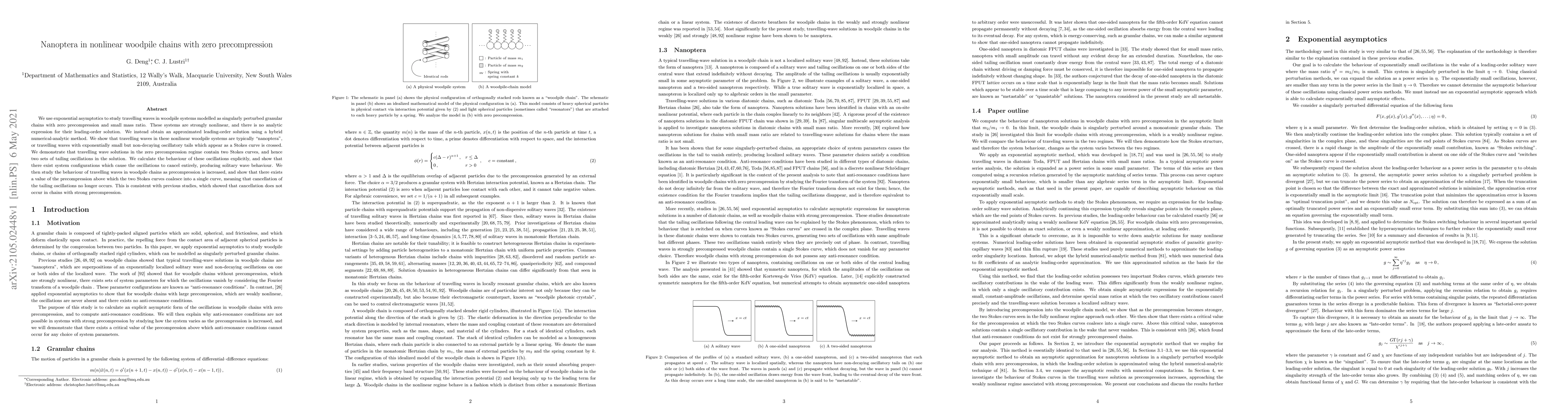 We use exponential asymptotics to study travelling waves in woodpile systems modelled as singularly perturbed granular chains with zero precompression and small mass ratio. These systems are strongly nonlinear, and there is no analytic expression for their leading-order solution. We instead obtain an approximated leading-order solution using a hybrid numerical-analytic method. We show that travelling waves in these nonlinear woodpile systems are typically "nanoptera", or travelling waves with exponentially small but non-decaying oscillatory tails which appear as a Stokes curve is crossed. We demonstrate that travelling wave solutions in the zero precompression regime contain two Stokes curves, and hence two sets of tailing oscillations in the solution. We calculate the behaviour of these oscillations explicitly, and show that there exist system configurations which cause the oscillations to cancel entirely, producing solitary wave behaviour. We then study the behaviour of travelling waves in woodpile chains as precompression is increased, and show that there exists a value of the precompression above which the two Stokes curves coalesce into a single curve, meaning that cancellation of the tailing oscillations no longer occurs. This is consistent with previous studies, which showed that cancellation does not occur in chains with strong precompression.