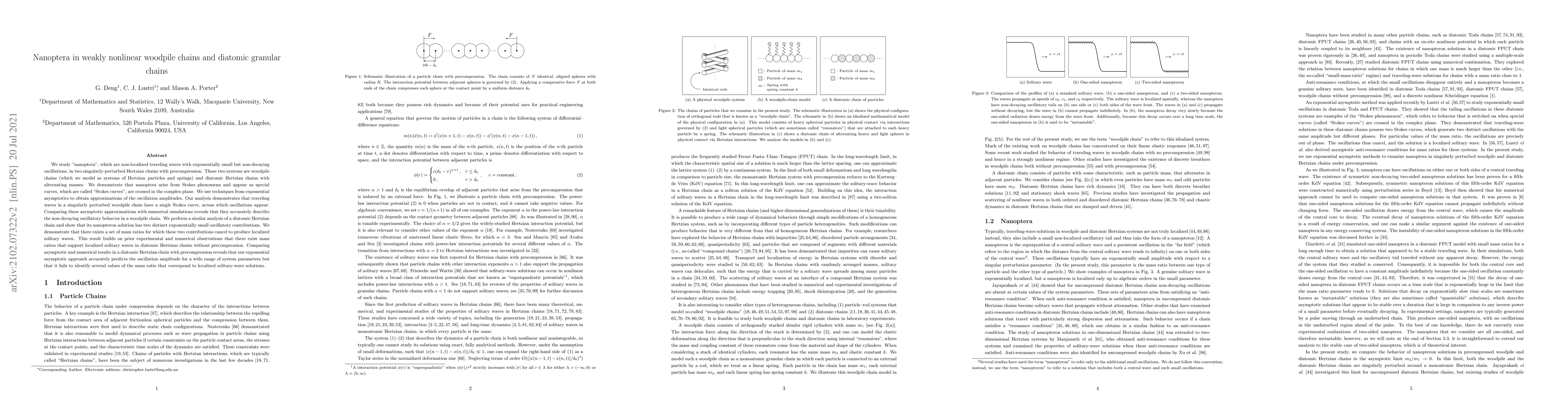 This paper investigates "nanoptera," non-decaying solitary waves in weakly nonlinear Hertzian woodpile and diatomic granular chains, revealing their emergence from Stokes phenomena. The study uses exponential asymptotics to predict oscillation amplitudes, showing accurate agreement with numerical simulations for woodpile chains but identifying discrepancies in diatomic chains regarding localized solitary waves.