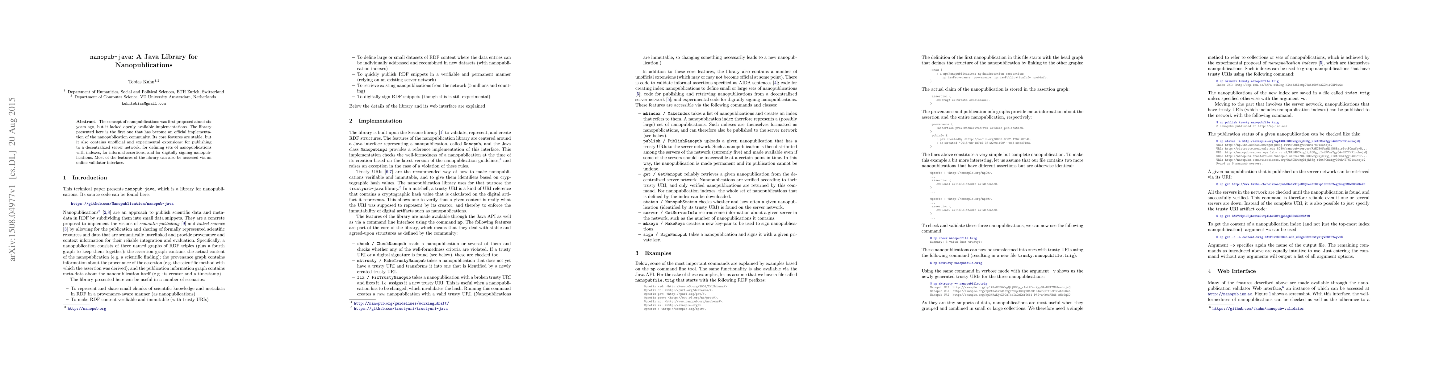 A new Java library called nanopub-java provides a first official implementation of nanopublications, enabling decentralized publishing with features like digital signing and validator interfaces.