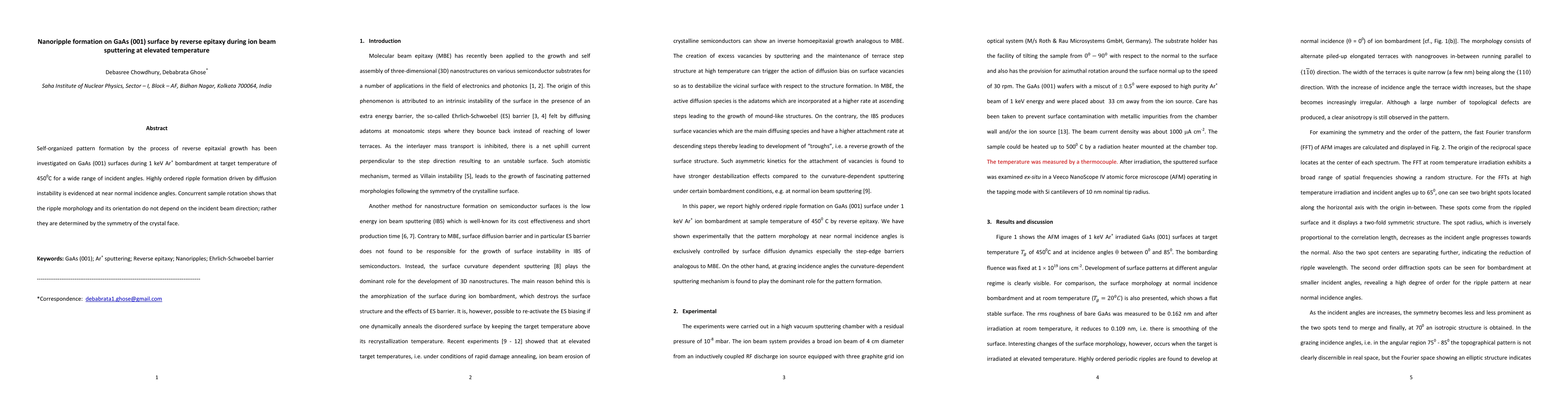 Researchers investigated reverse epitaxy during ion beam sputtering on GaAs surfaces at elevated temperatures, discovering self-organized ripple formation driven by diffusion instability. The ripple morphology is determined by the crystal face symmetry, regardless of incident beam direction.