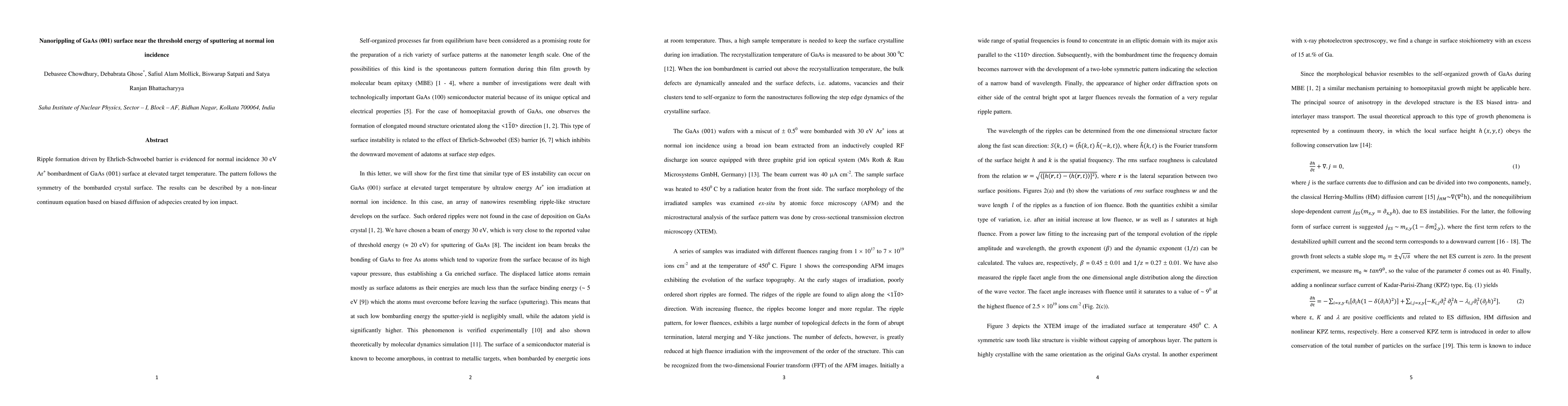 Ripple formation driven by Ehrlich-Schwoebel barrier is evidenced for normal incidence 30 eV Ar+ bombardment of GaAs (001) surface at elevated target temperature. The pattern follows the symmetry of the bombarded crystal surface. The results can be described by a non-linear continuum equation based on biased diffusion of adspecies created by ion impact.