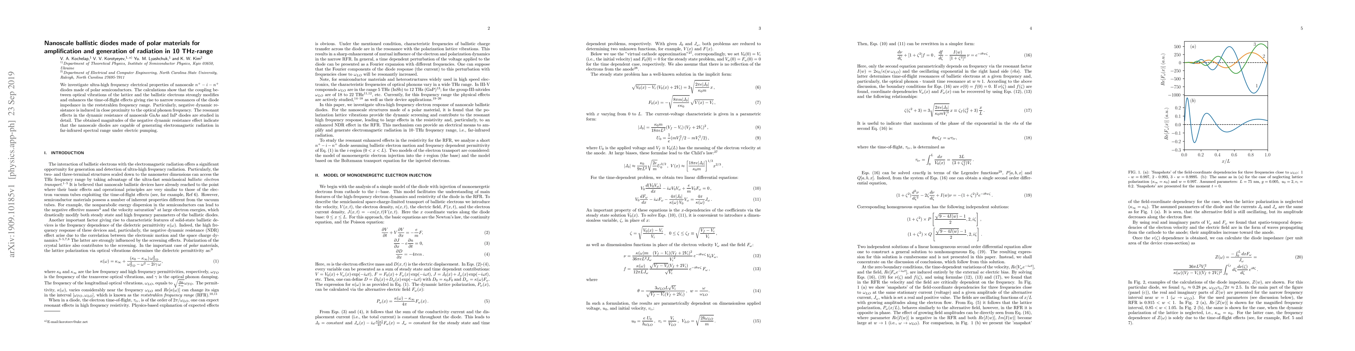 We investigate ultra-high frequency electrical properties of nanoscale $n^+$-$i$-$n^+$ diodes made of polar semiconductors. The calculations show that the coupling between optical vibrations of the lattice and the ballistic electrons strongly modifies and enhances the time-of-flight effects giving rise to narrow resonances of the diode impedance in the reststrahlen frequency range. Particularly, negative dynamic resistance is induced in close proximity to the optical phonon frequency. The resonant effects in the dynamic resistance of nanoscale GaAs and InP diodes are studied in detail. The obtained magnitudes of the negative dynamic resistance effect indicate that the nanoscale diodes are capable of generating electromagnetic radiation in far-infrared spectral range under electric pumping.