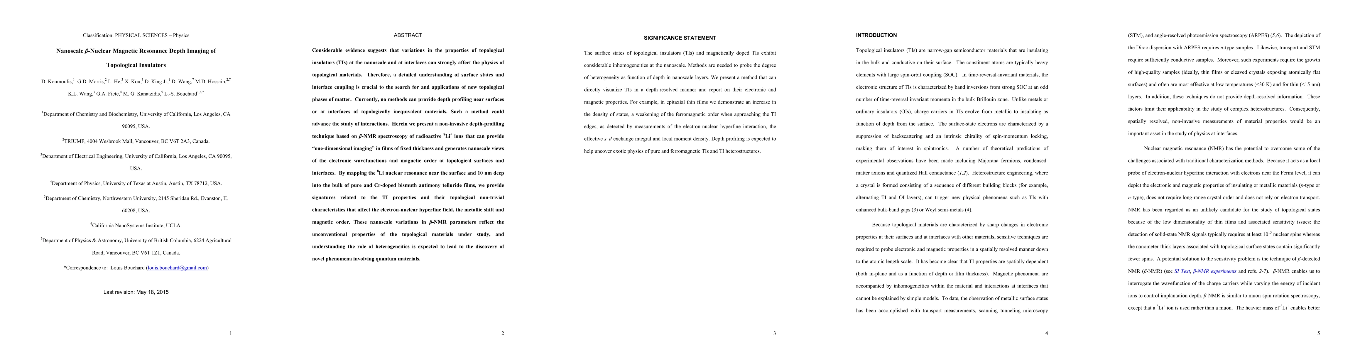 Considerable evidence suggests that variations in the properties of topological insulators (TIs) at the nanoscale and at interfaces can strongly affect the physics of topological materials. Therefore, a detailed understanding of surface states and interface coupling is crucial to the search for and applications of new topological phases of matter. Currently, no methods can provide depth profiling near surfaces or at interfaces of topologically inequivalent materials. Such a method could advance the study of interactions. Herein we present a non-invasive depth-profiling technique based on $\beta$-NMR spectroscopy of radioactive $^8$Li$^+$ ions that can provide "one-dimensional imaging" in films of fixed thickness and generates nanoscale views of the electronic wavefunctions and magnetic order at topological surfaces and interfaces. By mapping the $^8$Li nuclear resonance near the surface and 10 nm deep into the bulk of pure and Cr-doped bismuth antimony telluride films, we provide signatures related to the TI properties and their topological non-trivial characteristics that affect the electron-nuclear hyperfine field, the metallic shift and magnetic order. These nanoscale variations in $\beta$-NMR parameters reflect the unconventional properties of the topological materials under study, and understanding the role of heterogeneities is expected to lead to the discovery of novel phenomena involving quantum materials.