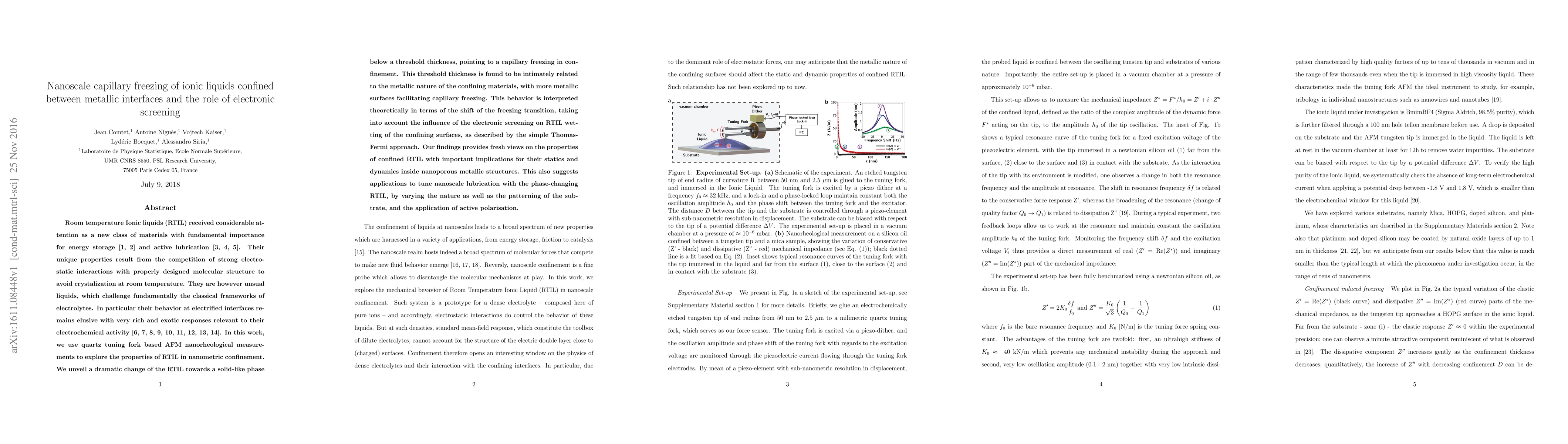 This research reveals that room temperature ionic liquids (RTIL) can transition to a solid-like phase when confined in nanometric spaces between metallic interfaces, a phenomenon called capillary freezing. The study uses atomic force microscopy (AFM) measurements and links this transition to the metallic nature of confining materials and electronic screening effects, suggesting potential applications in nanoscale lubrication and tunable phase-changing materials.
