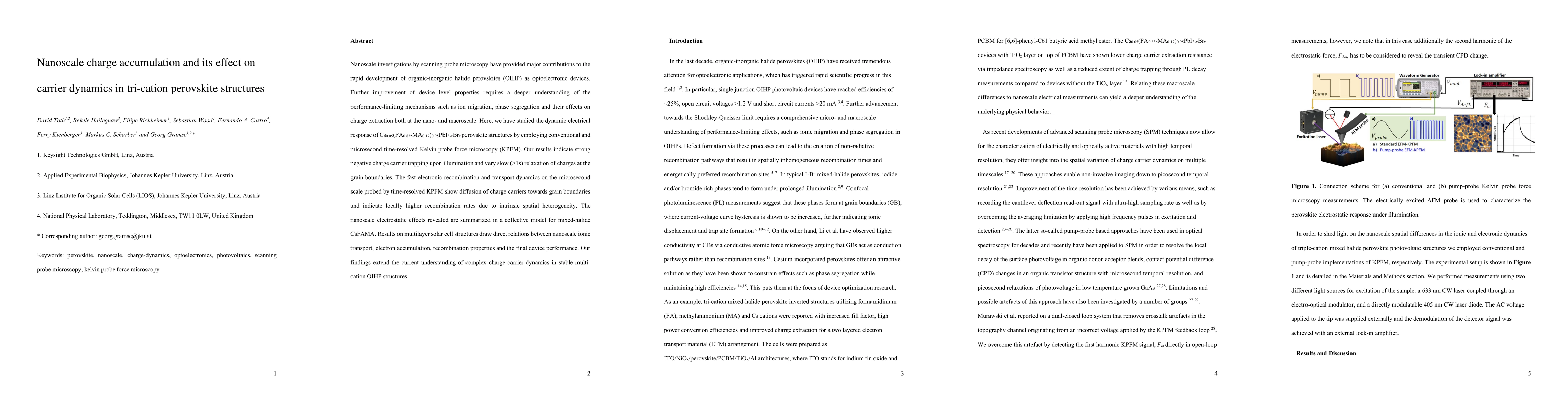 This study investigates nanoscale charge accumulation and its impact on carrier dynamics in tri-cation perovskite structures using time-resolved Kelvin probe force microscopy. The research reveals significant charge trapping and slow relaxation at grain boundaries, highlighting the role of spatial heterogeneity in recombination and transport dynamics, which ultimately affects device performance.