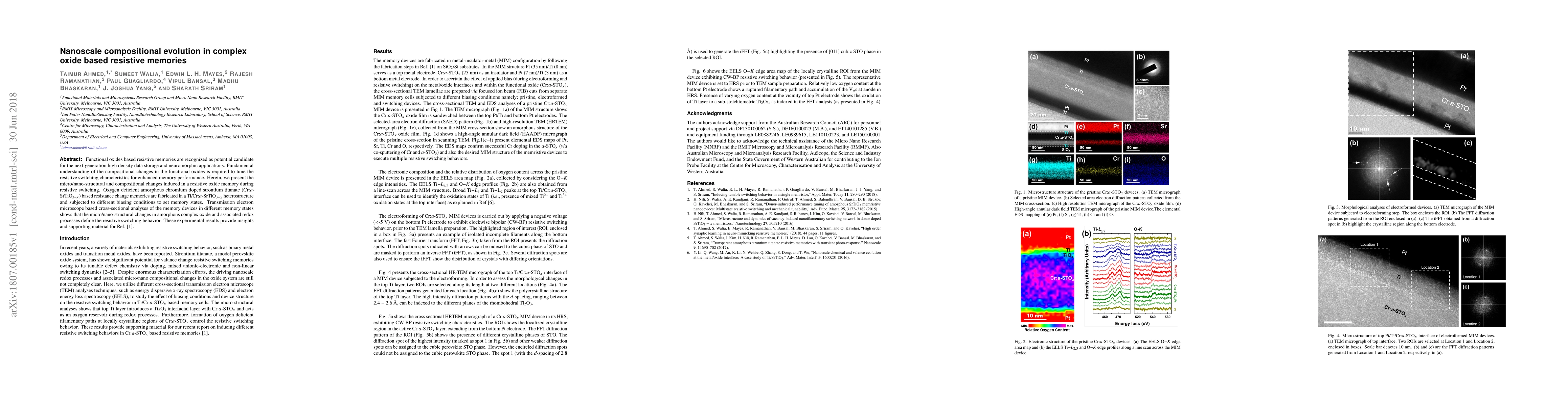 Functional oxides based resistive memories are recognized as potential candidate for the next-generation high density data storage and neuromorphic applications. Fundamental understanding of the compositional changes in the functional oxides is required to tune the resistive switching characteristics for enhanced memory performance. Herein, we present the micro/nano-structural and compositional changes induced in a resistive oxide memory during resistive switching. Oxygen deficient amorphous chromium doped strontium titanate (Cr:$a$-SrTiO$_{3-x}$) based resistance change memories are fabricated in a Ti/Cr:$a$-SrTiO$_{3-x}$ heterostructure and subjected to different biasing conditions to set memory states. Transmission electron microscope based cross-sectional analyses of the memory devices in different memory states shows that the micro/nano-structural changes in amorphous complex oxide and associated redox processes define the resistive switching behavior. These experimental results provide insights and supporting material for Ref. [1].